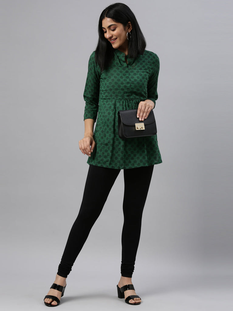 Go the ethnic way with our Solid Black Cropped Leggings. Made from Cotton & Elastane, it has a elasticised waistband, slim fit & is of 7/8th length.