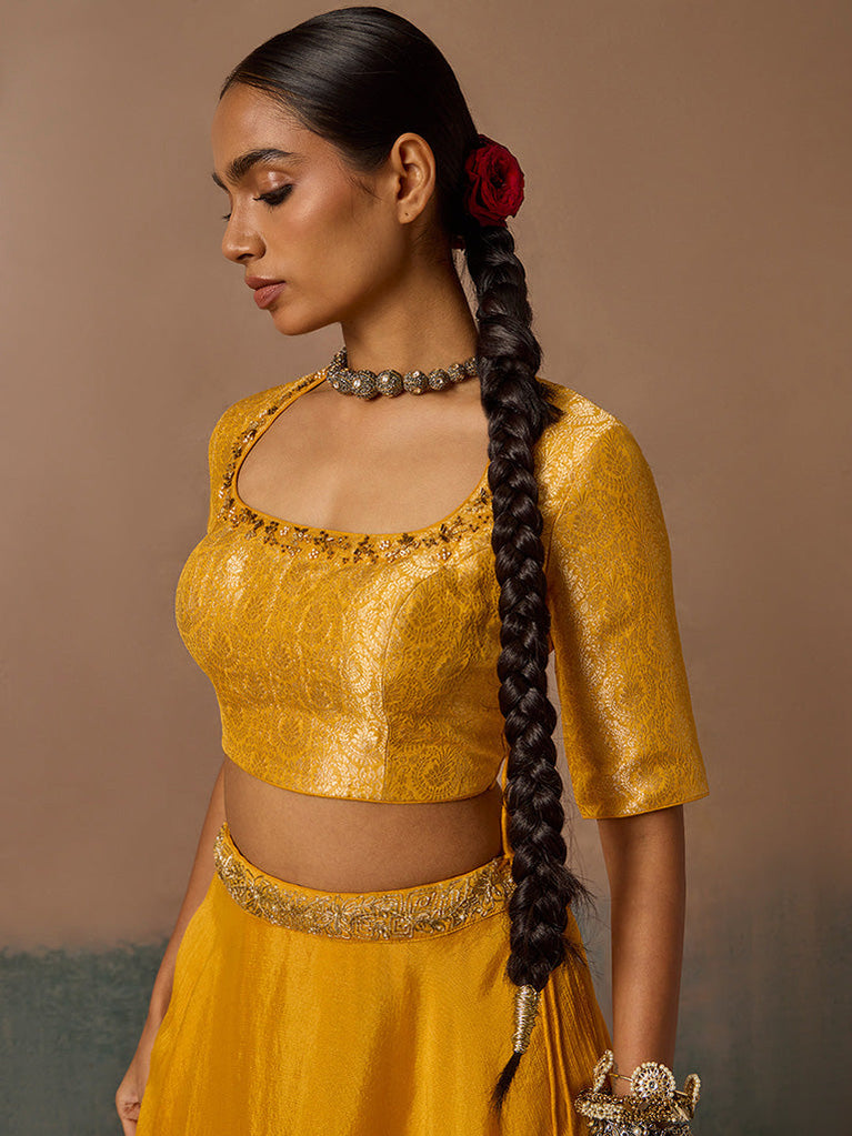 A statement blouse that brings together rich craft and a modern, sculpted silhouette. The brocade fabric is woven with floral and paisley motifs that carry a soft metallic sheen, while the broad scoop neckline is outlined with intricate beadwork for a refined finish. Elbow-length sleeves keep the shape balanced, leading to a dramatic open back secured with a top button and a lower hook closure.