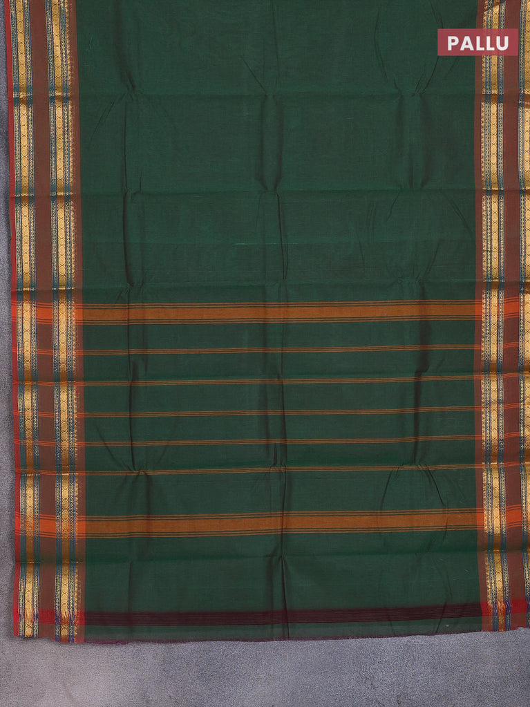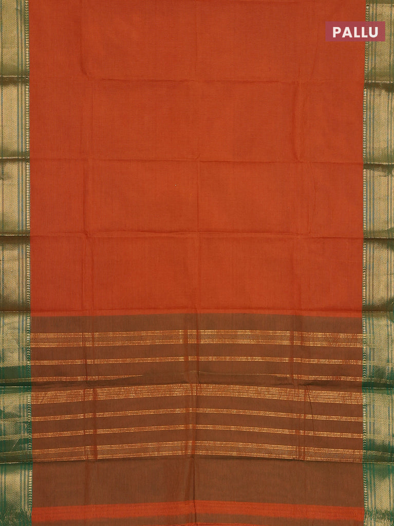 Chettinad cotton saree dual shade of green and red with plain body and zari woven border