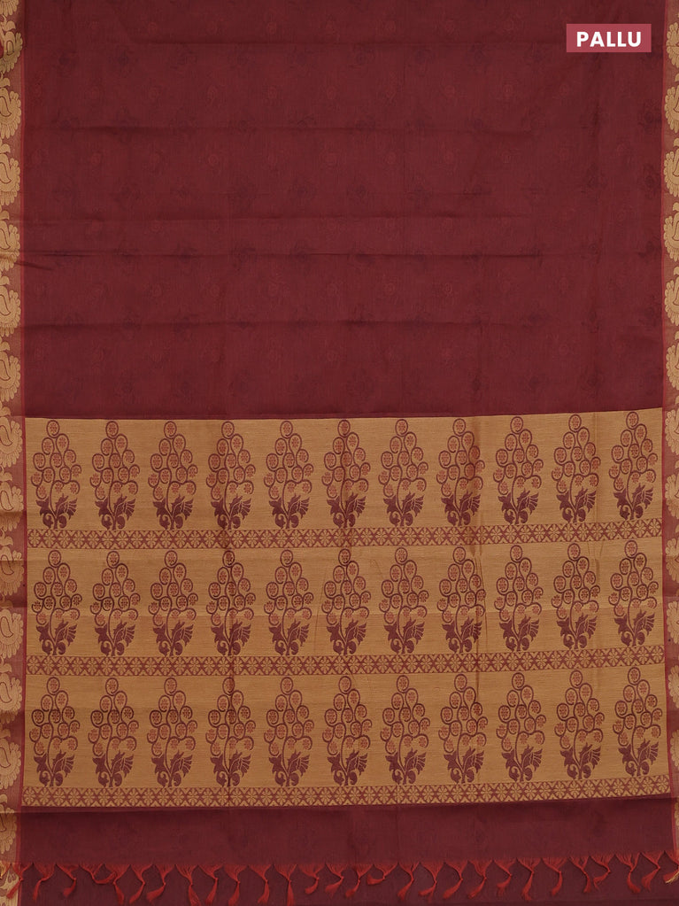 Coimbatore cotton saree deep maroon and sandal with allover self emboss and thread woven border
