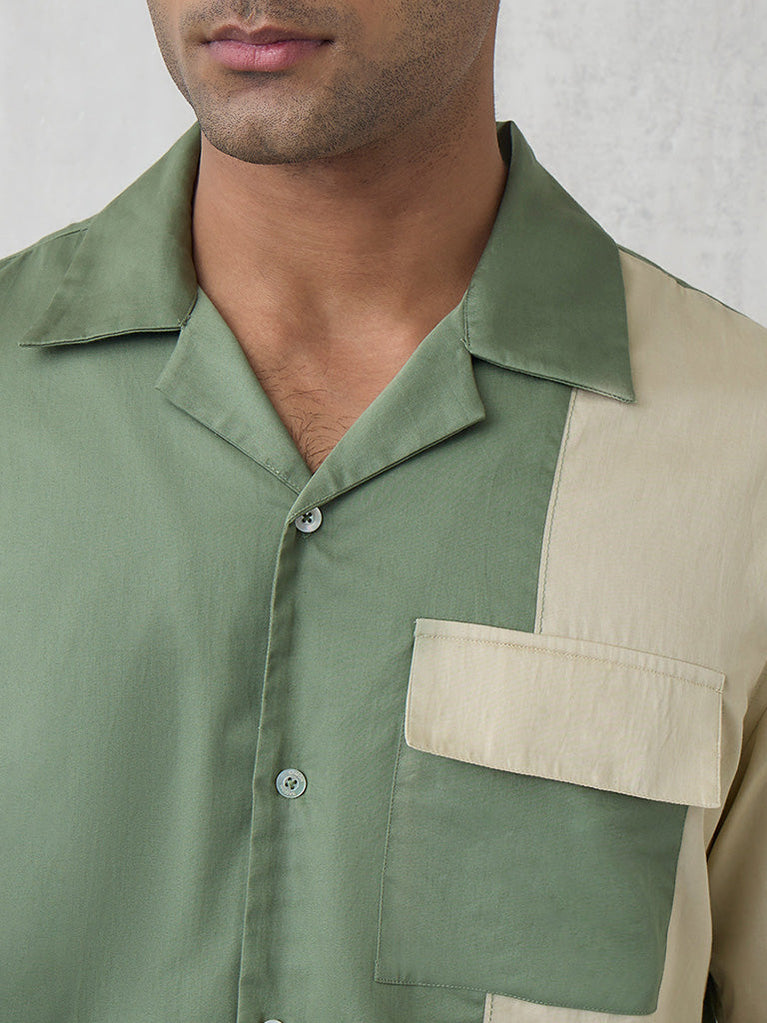 Bold color-blocking makes this olive shirt a festive standout. A notched collar, short sleeves and split pocket detail create relaxed charm, ideal for modern celebratory edits.
