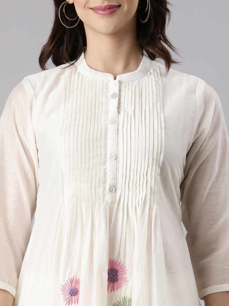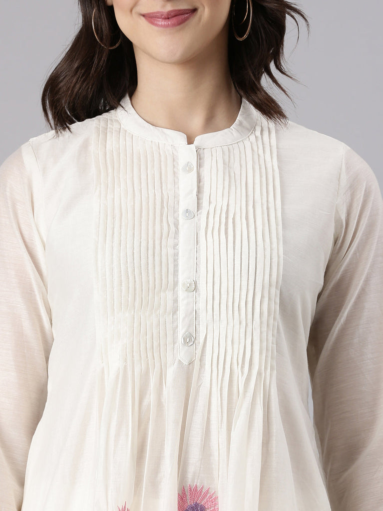 Cream Abstract Printed Organza Sheer Straight Kurta with Mirror Embroidered Neck