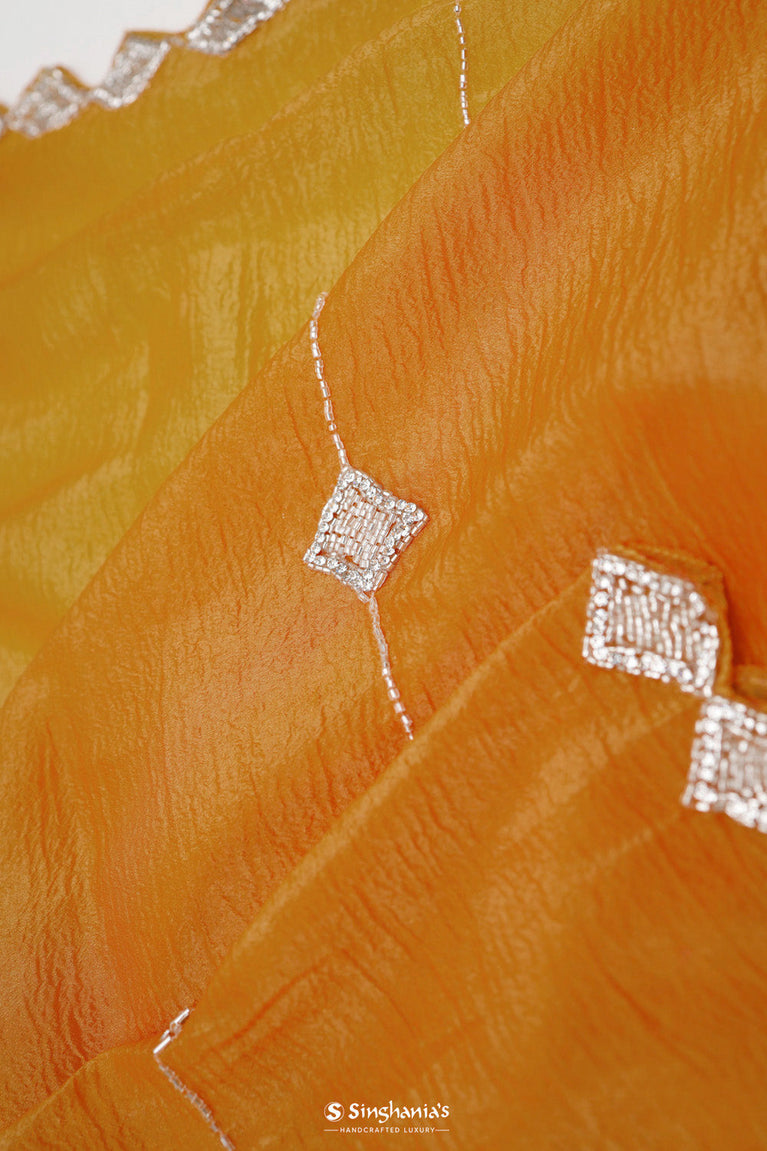 A saree that glows as beautifully as you do! This dahlia yellow saree is woven with tissue fabric, creating a soft, radiant shimmer. Accentuated with glass beads and stones, stripes embroidery, it’s an excellent choice for festivals, receptions and grand celebrations.