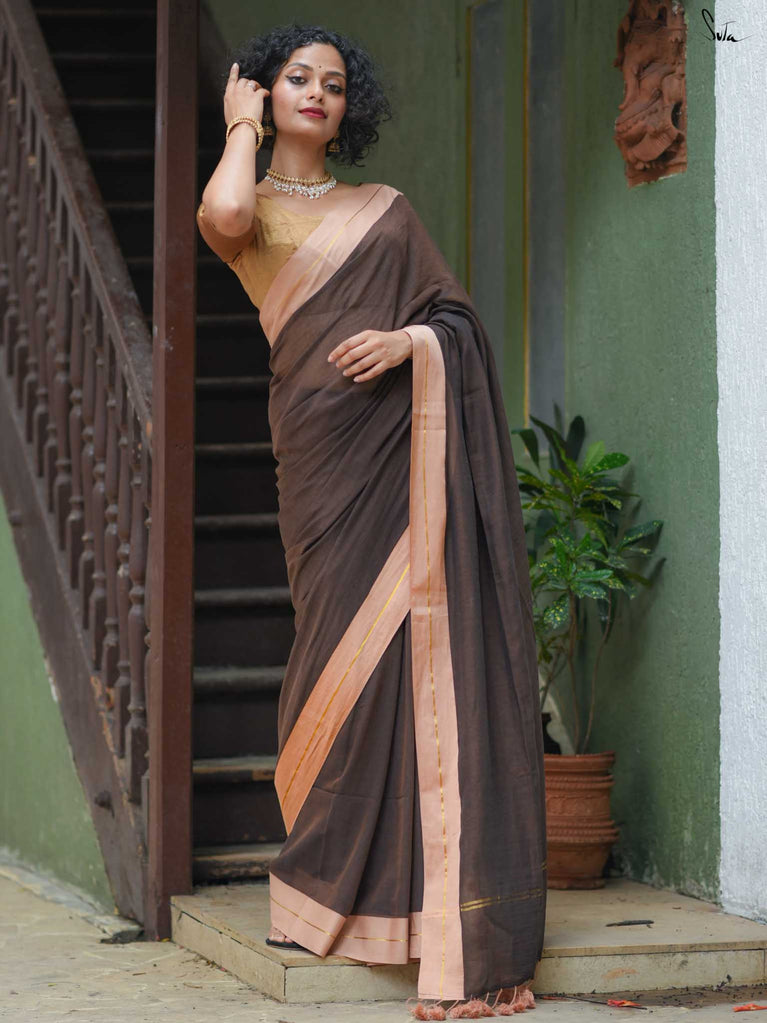 Earthy and comfortable, Dal Chini blends deep brown hues with a subtle zari border for a refined look. The beige jhalar tassels add softness to the rich woven mul cotton drape. A versatile choice for formal day events or understated festive occasions.
