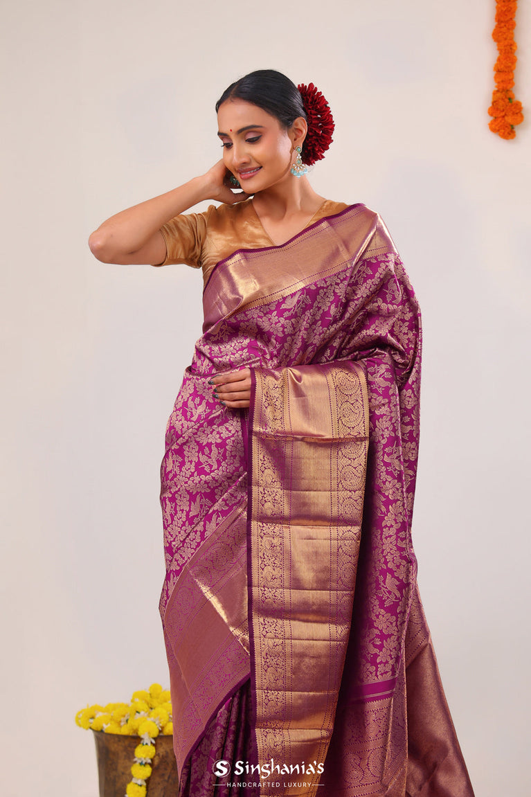A dark raspberry kanjivaram silk saree featuring the traditional floral jaal and birds woven in gold zari. The broad border displays classical floral-peacock patterns, while the pallu boasts an elaborate arrangement of floral vines. Ideal for traditional ceremonies and festive gatherings.