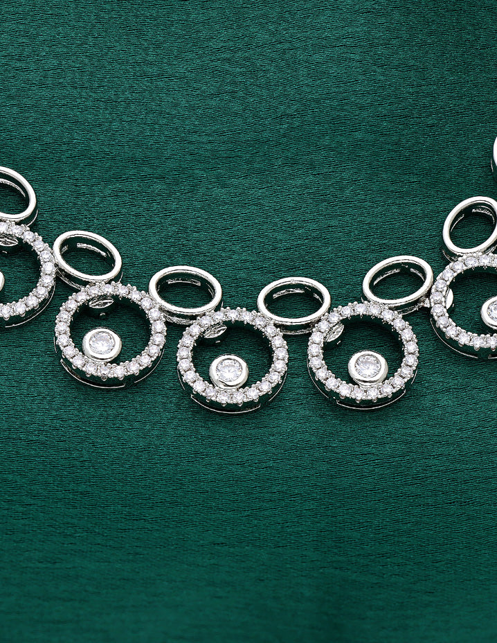 Make a statement with this rhodium polish necklace set, featuring elegant white AD stones. Perfect for any special occasion, it adds a sophisticated touch to your outfit.