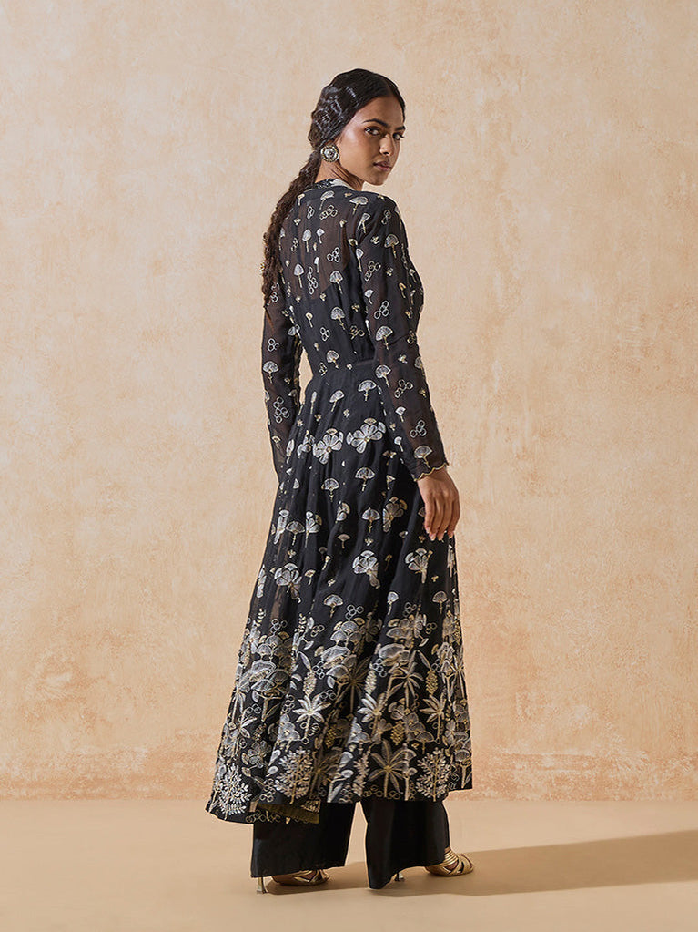 Regal yet refined, this green kurta shimmers softly in tissue silk, adorned with intricate gold and silver zardozi embroidery. Floral vines trace the hem and cuffs, while scattered motifs lend a delicate luminosity across the body. Finished with a high round neckline and flared sleeves, it’s an exquisite choice for festive soirées and traditional celebrations.