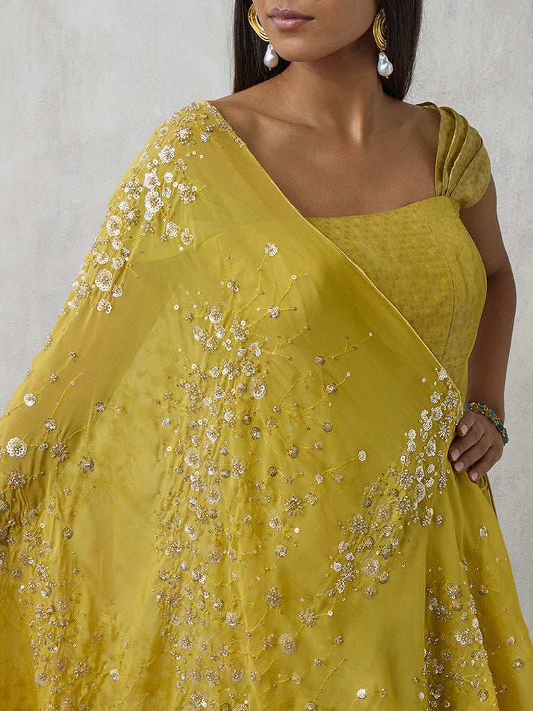 This yellow embellished cape is designed to instantly elevate festive separates. Woven in sheer fabric, it is scattered with sequins and delicate embroidery that catch the light with every movement. Finished with playful tassel ties at the side, it layers beautifully over kurtas, dresses, or blouses to bring a touch of glamour to any celebration.
