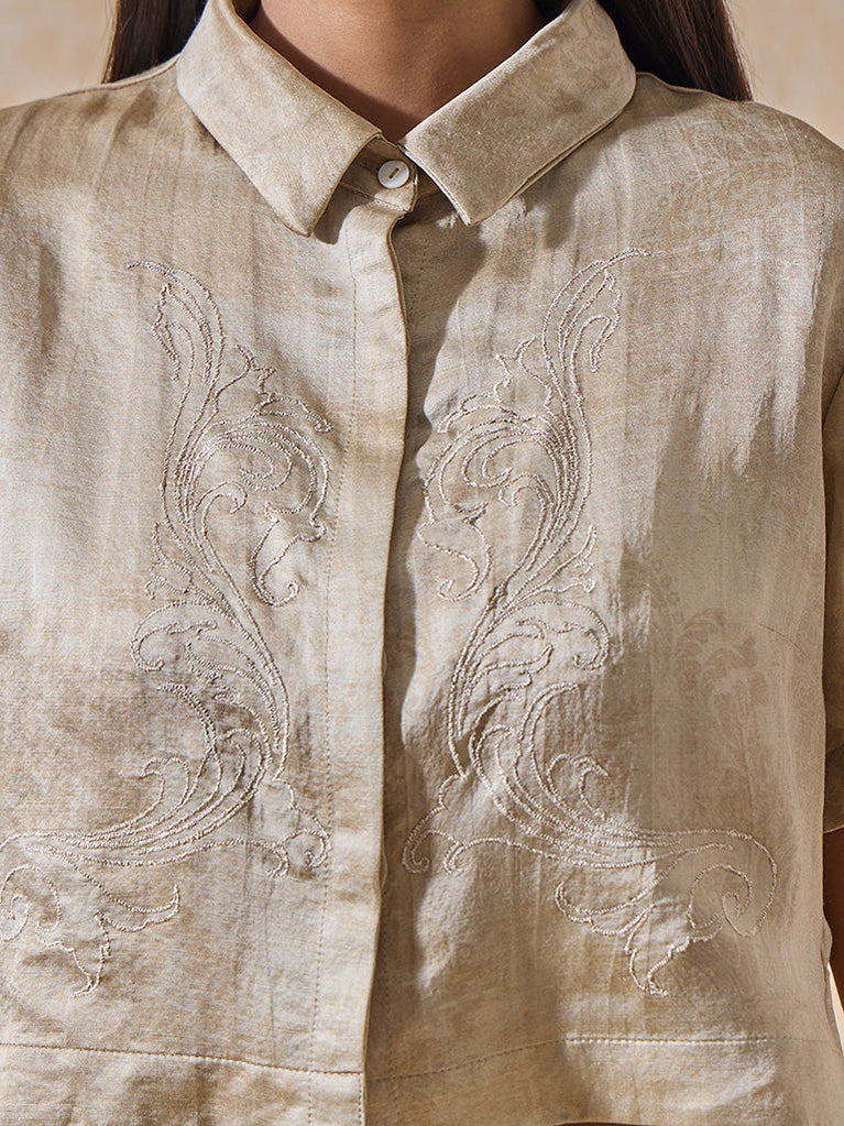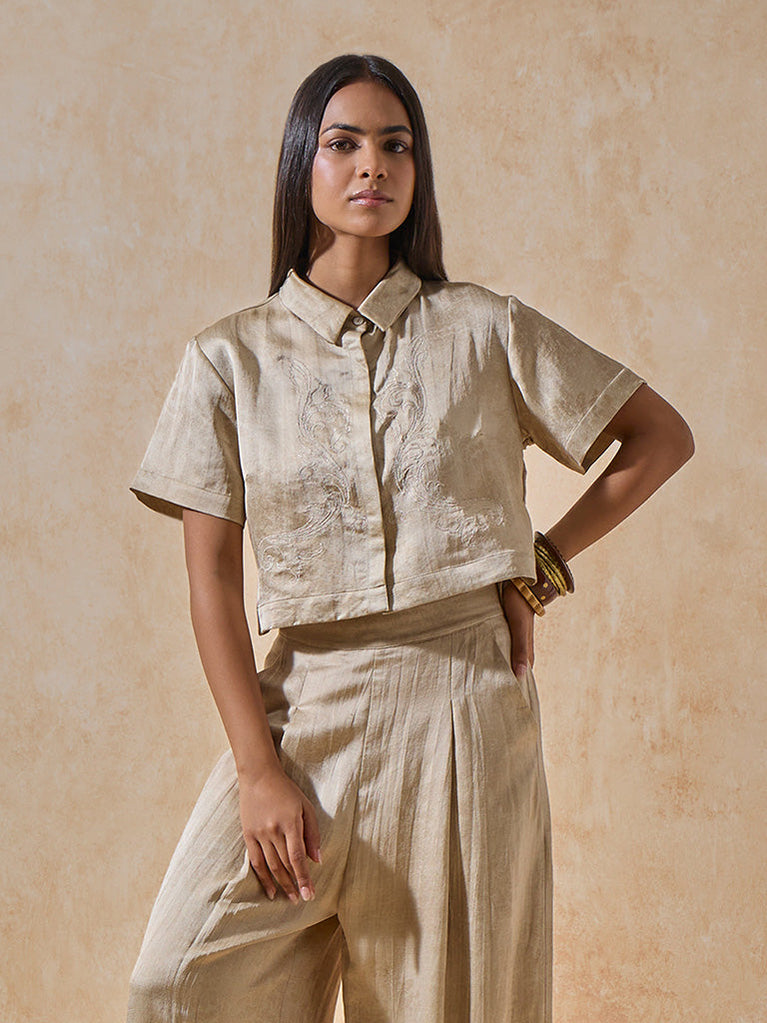 A modern spin on occasion wear staples, this beige shirt features a collar, half sleeves and a cropped hem. The highlight lies in the intricate tonal embroidery tracing the front, lending quiet drama to the structured cut. A versatile piece that works effortlessly for cocktail nights or dressed-up day events.