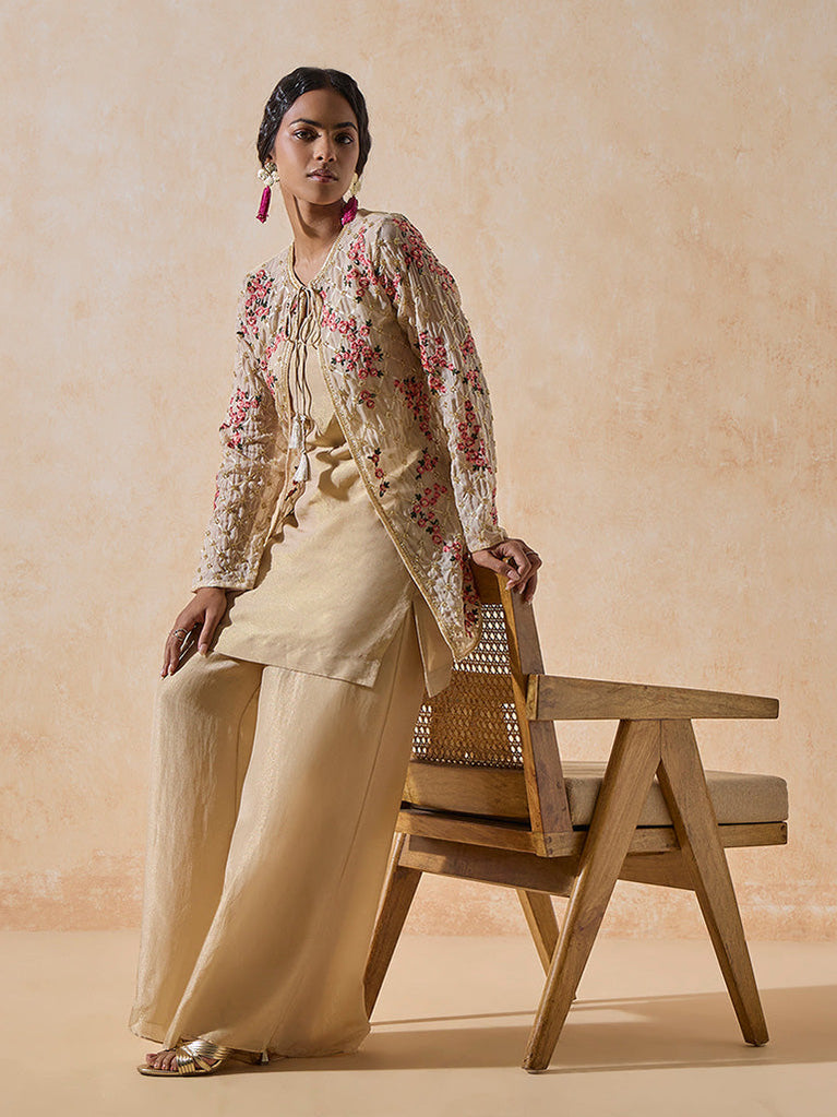 Enhance your ethnic semblance with a chic layering option, like this kurta. Thoughtfully crafted with a mix of Geometric patterned sequins, vivid floral embroidery and delicate beadwork along the placket and collar, this separate comes finished with full length sleeves and a tie-up feature with tassels for added style.