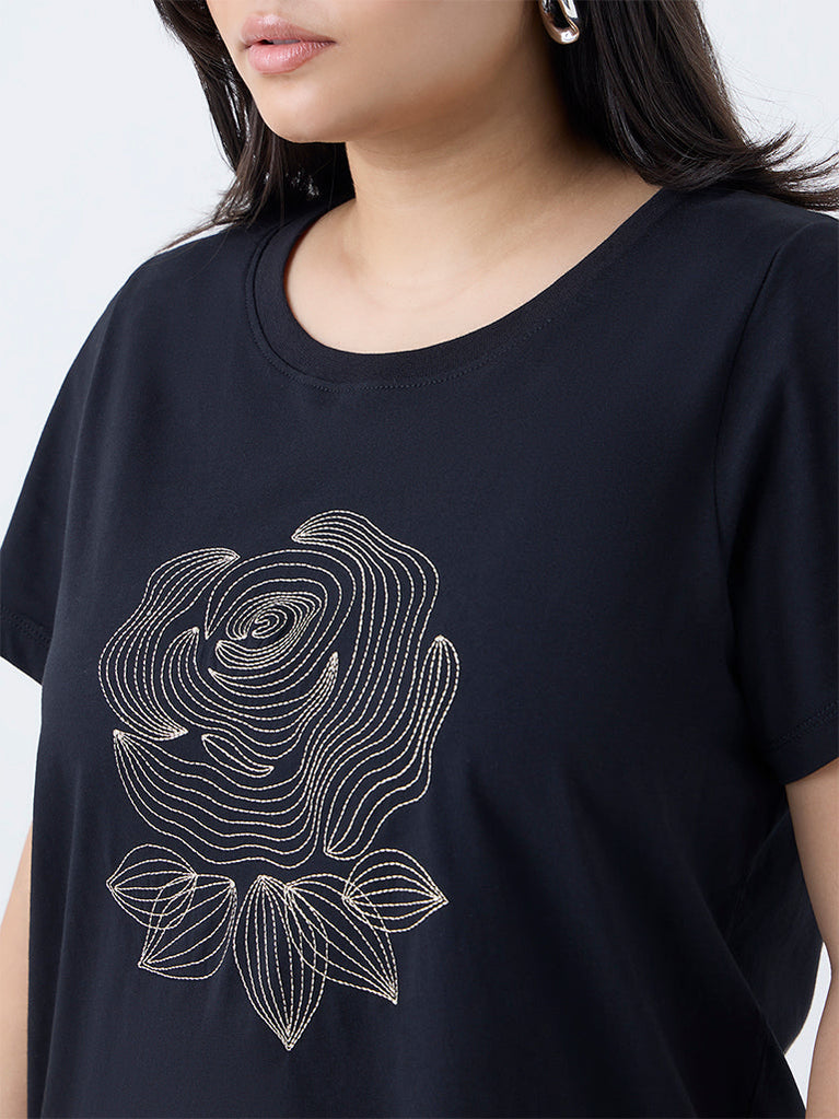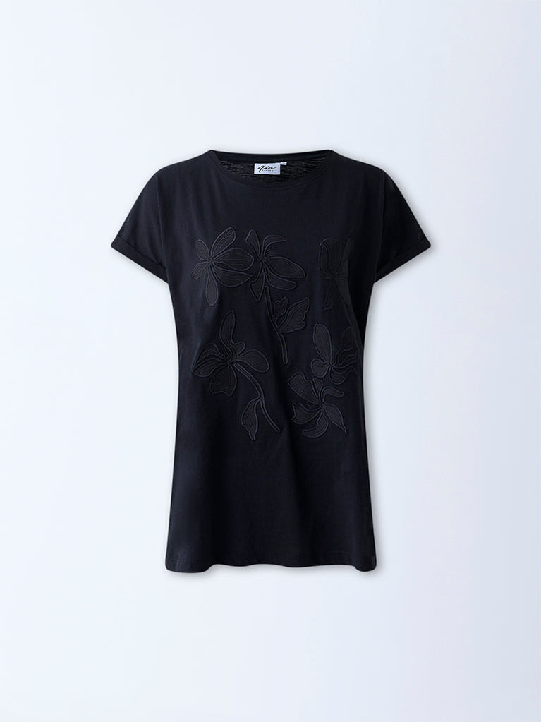 Gia Black Floral Embroidered Cotton T-Shirt