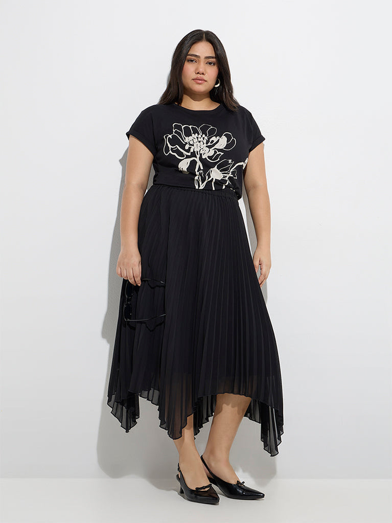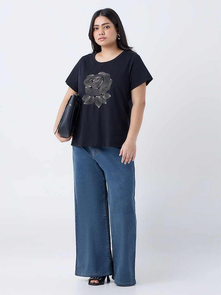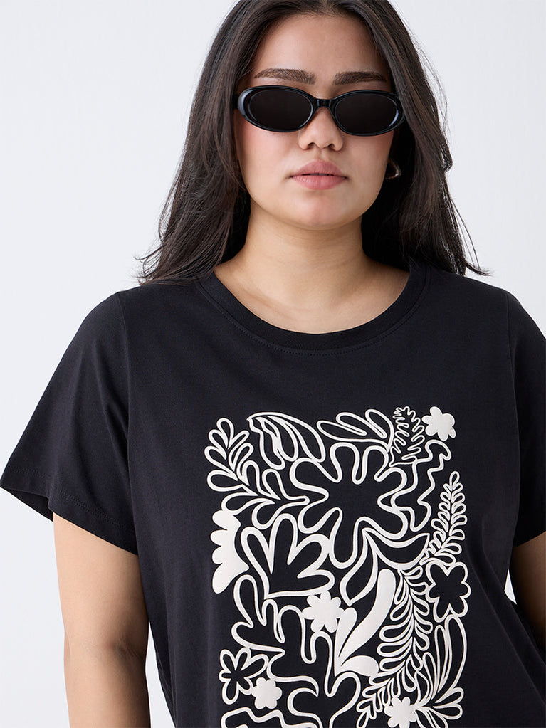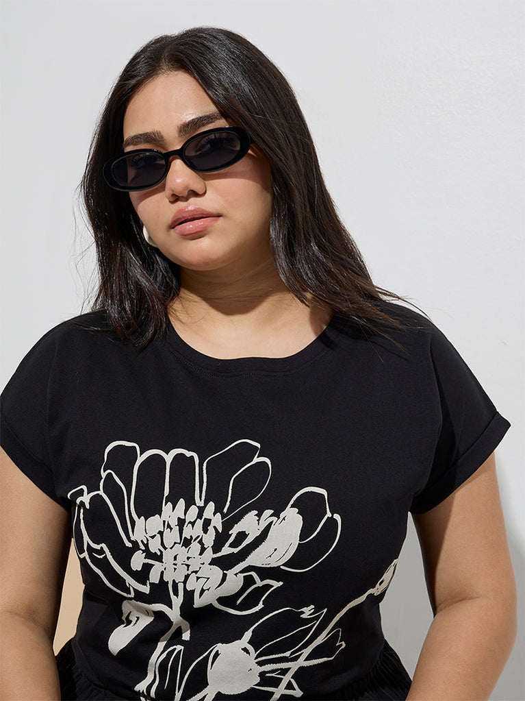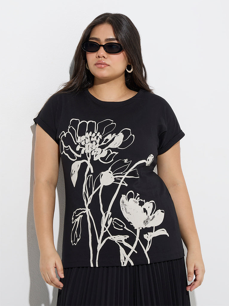 Gia Black Floral Pattern Cotton T-Shirt