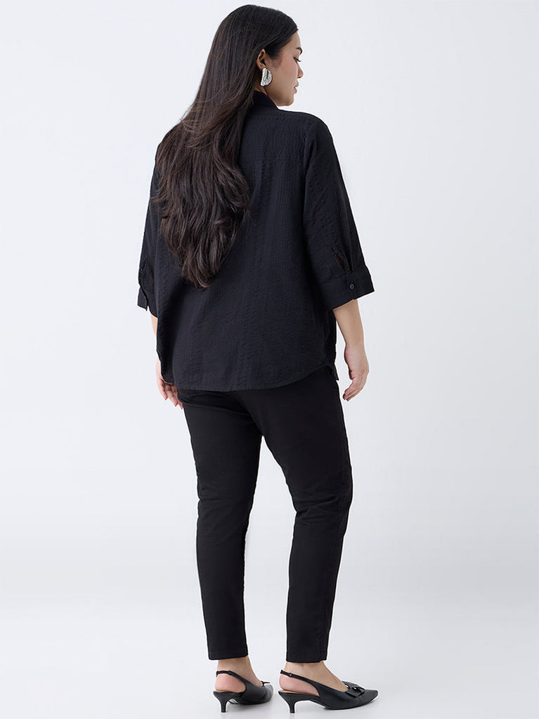 Understated yet striking, this black shirt from Gia brings modern detailing to a wardrobe essential. The structured collar and three-fourth sleeves offer polished balance, while the asymmetric hem adds an unexpected edge for contemporary appeal.