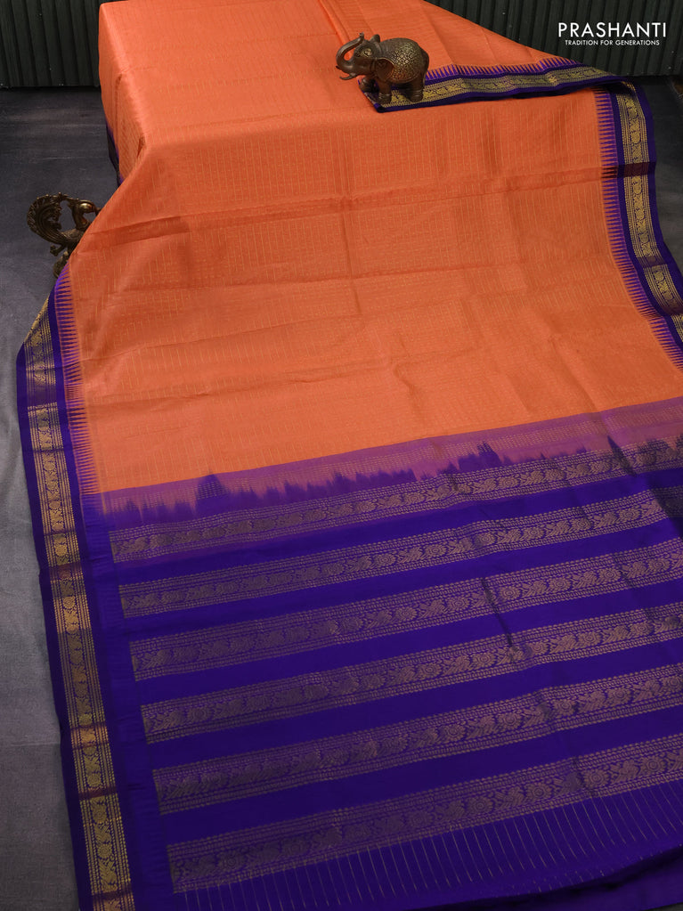 Kuppadam silk cotton saree peach orange and blue with allover small zari checks & lakshadeepam weaves and temple design zari woven border
