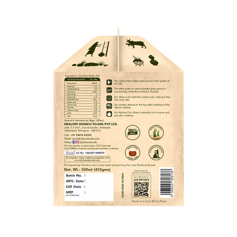 Handcrafted by the native gwalas of Kutch, Jivika Organics A2 Kankrej Cow Ghee is rich with all the Ayurvedic benefits of traditional Bilona™ ghee. Churned from the nutritious Whole Curds of A2 Kankrej Cow Milk, this ghee is free from harmful trans fats and cholesterol. Each drop of Kankrej Cow Ghee is made with the principles of Purity™ and Authenticity™ above all.