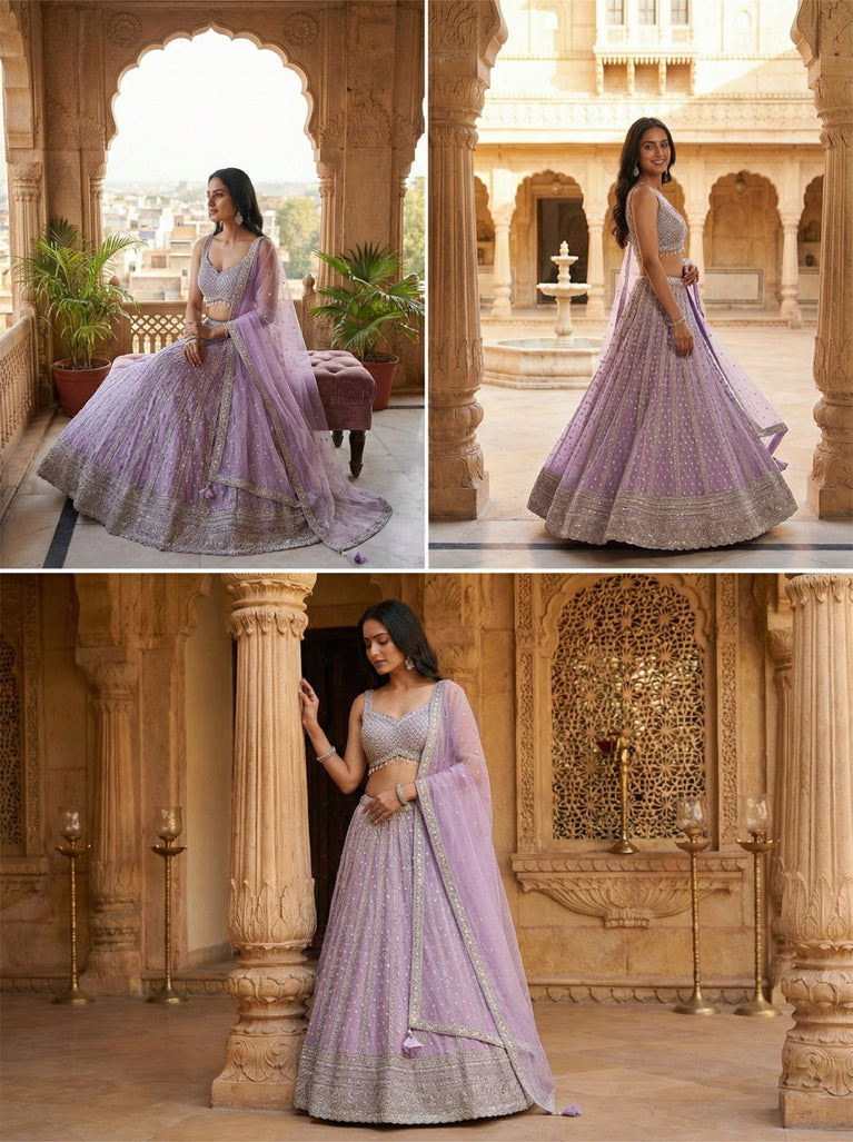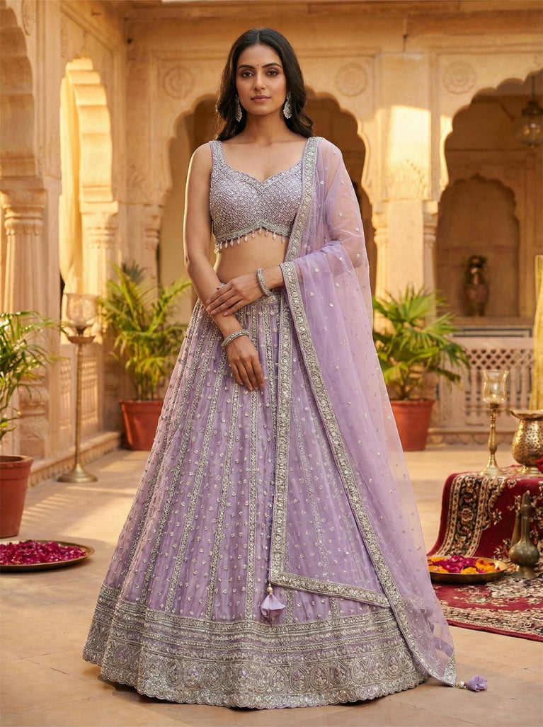 Elevate your festive wardrobe with this exquisite lilac ghagra set, meticulously crafted from premium net fabric. The ensemble features elaborate sequin and stone embroidery work that catches light beautifully, creating a mesmerizing shimmer with every movement. The intricate detailing showcases traditional craftsmanship combined with contemporary design sensibilities, making it an ideal choice for weddings, celebrations, and special occasions. The flowing silhouette of the ghagra ensures graceful draping and comfortable wear throughout your event. Perfect for those who appreciate refined ethnic fashion with substantial embellishment and timeless appeal.