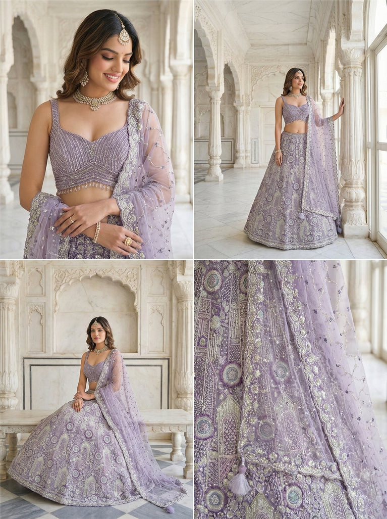 Lilac Net Heavy Sequins And Stone Embroidery Ghagra Set