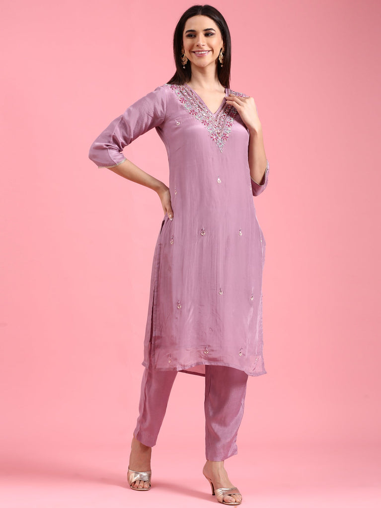Lilac Organza Hand Embroidery Three Piece Suit Set