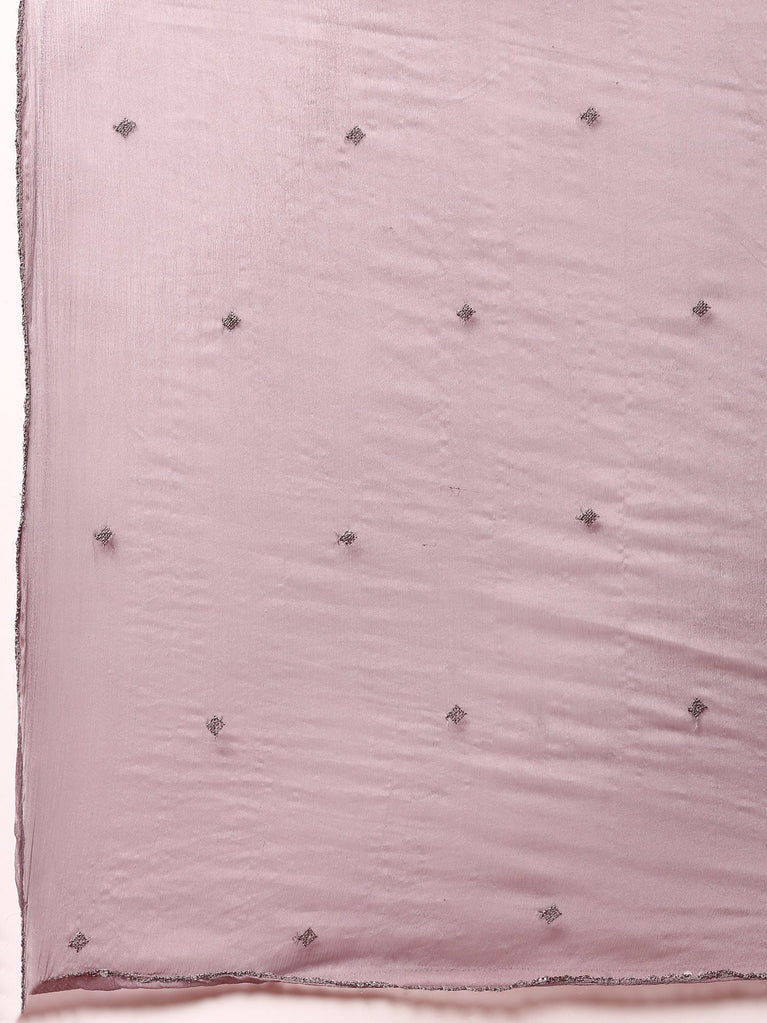 Elevate your ethnic wardrobe with this exquisite Lilac Chinnon three-piece ensemble. Crafted from premium chinnon fabric, known for its lightweight breathability and elegant drape, this set combines traditional sophistication with contemporary styling. The soft lilac hue offers versatility for both festive occasions and everyday wear.
