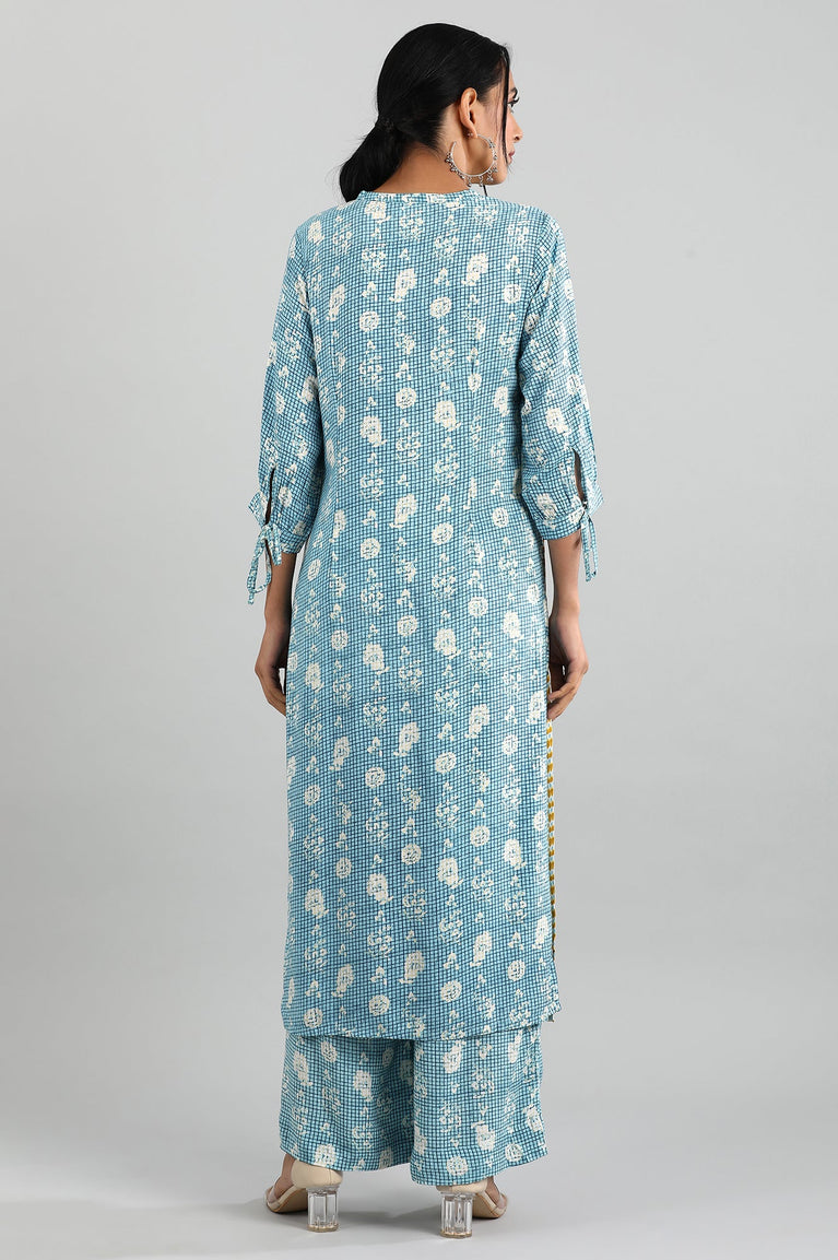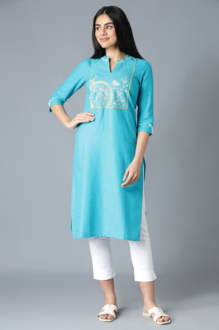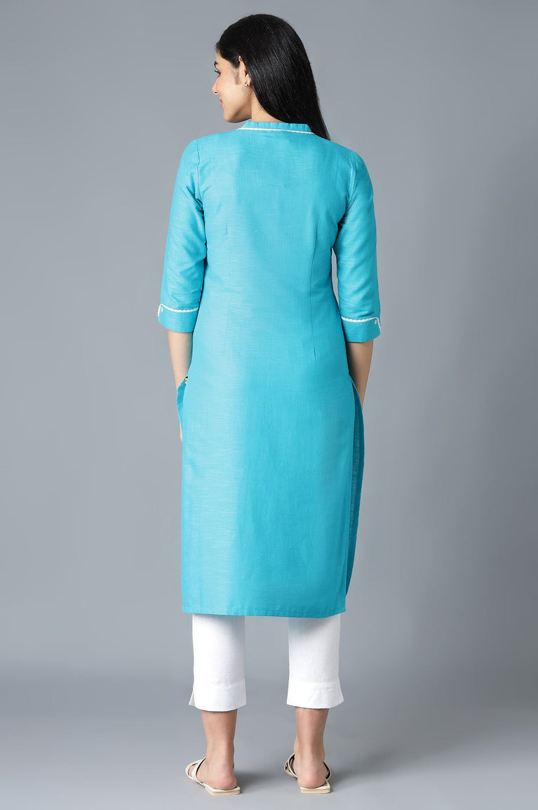 Blue band collar straight kurta with printed detail and placket on the front.