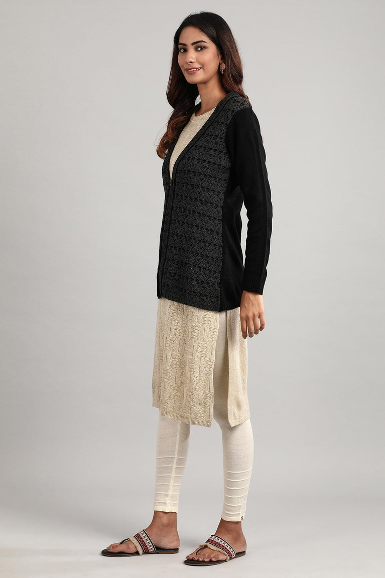 Black V-neck full sleeve self-designed sweater with button closure on the front.