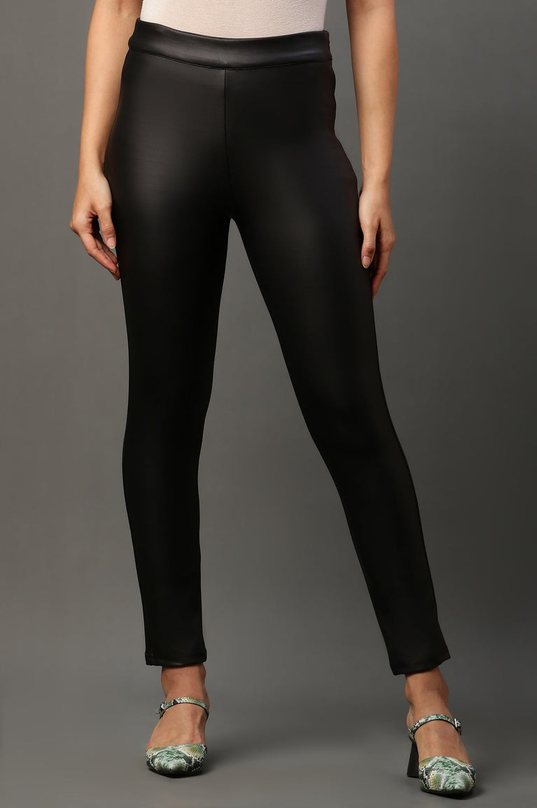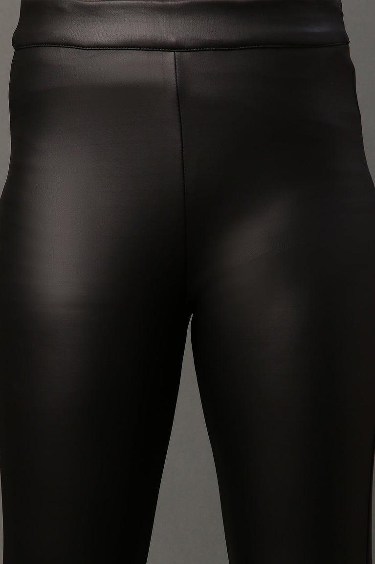 Crafted for the modern woman, these black slim-fit pants redefine elegance with their sleek leather-like finish. The knit fabric ensures a comfortable yet structured fit, while the side zip closure adds a touch of practicality and sophistication. Designed with functional back pockets, these pants seamlessly blend style and utility. Perfect for casual outings or chic evening events, pair them with a tailored top and statement footwear for a polished look.