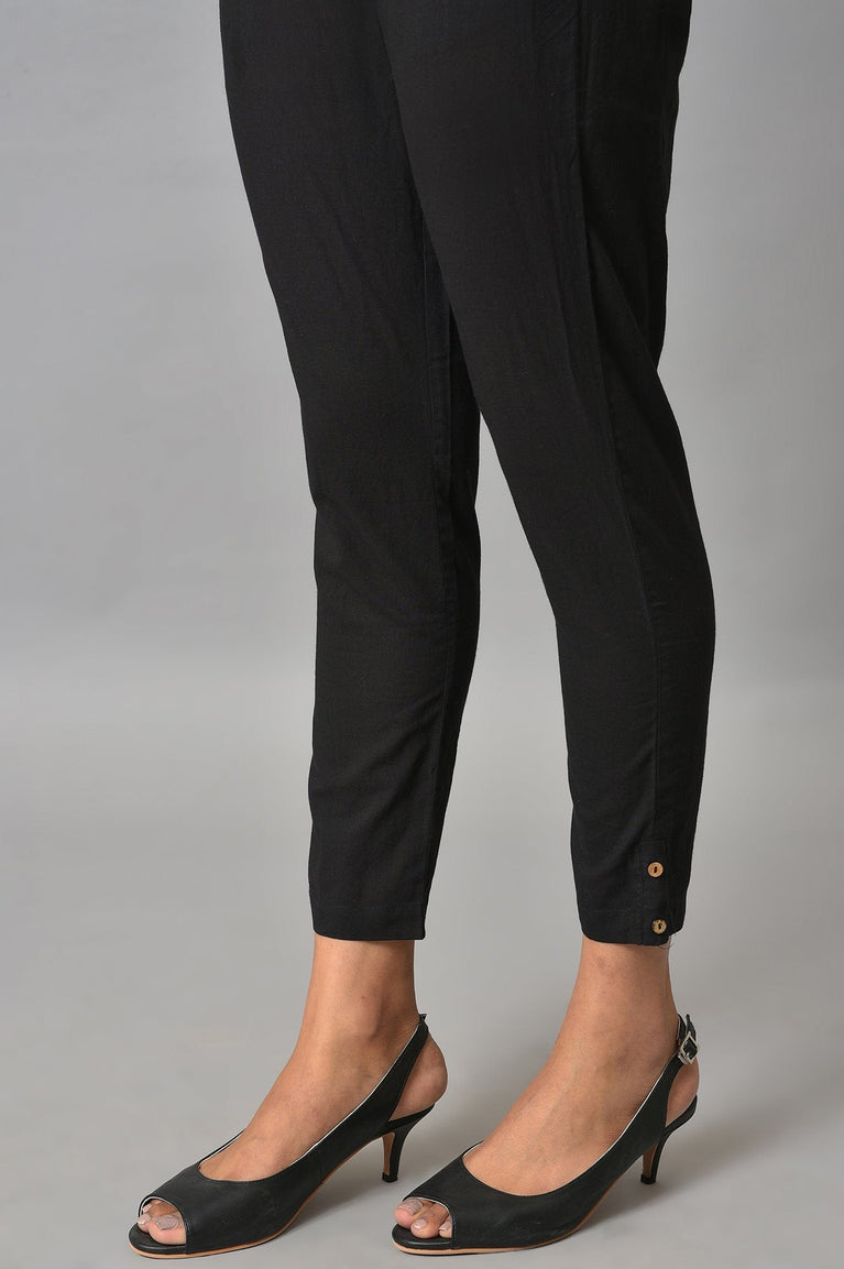 Black Solid Straight Fit Cotton Pants With Button And Zip Closure