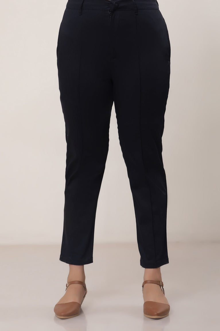 Micro-geometric precision weaving meets modern sophistication in these black solid straight-fit pants. Crafted from a comfortable cotton blend with 95% cotton and 5% lycra, these trousers offer a sleek silhouette perfect for a professional setting. The button and zip closure ensures a secure fit, while the woven fabric provides durability and a polished appearance. Pair these versatile trousers with a silk blouse and classic pumps for a timeless office look. An essential addition to any woman's professional wardrobe, offering style and functionality for the workplace.