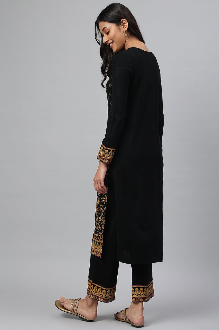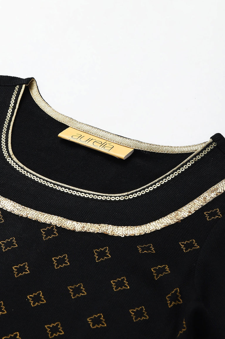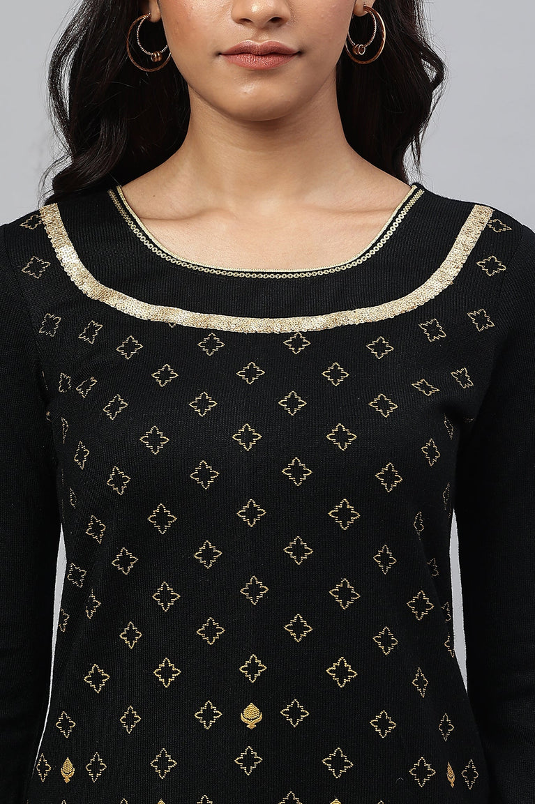 Black coloured straight kurta having ornamenral glitter print, round neck type, three-quarter sleeves and side slits.