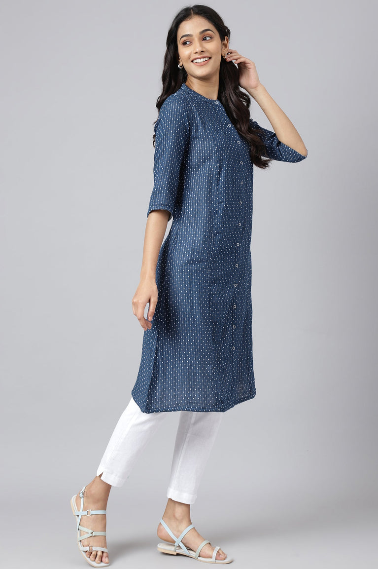 Crafted in breathable blue cotton dobby, this kurta is a winning choice for both : everyday and special occassions. It consists of an overlapped mandarin collar and a curved cuff detail on the sleeves.