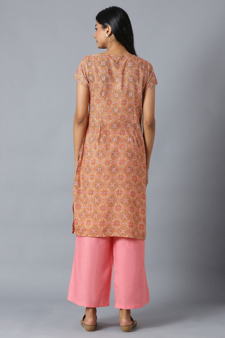 Brown Floral Printed kurta In Round Neck With Pink Straight Palazzo