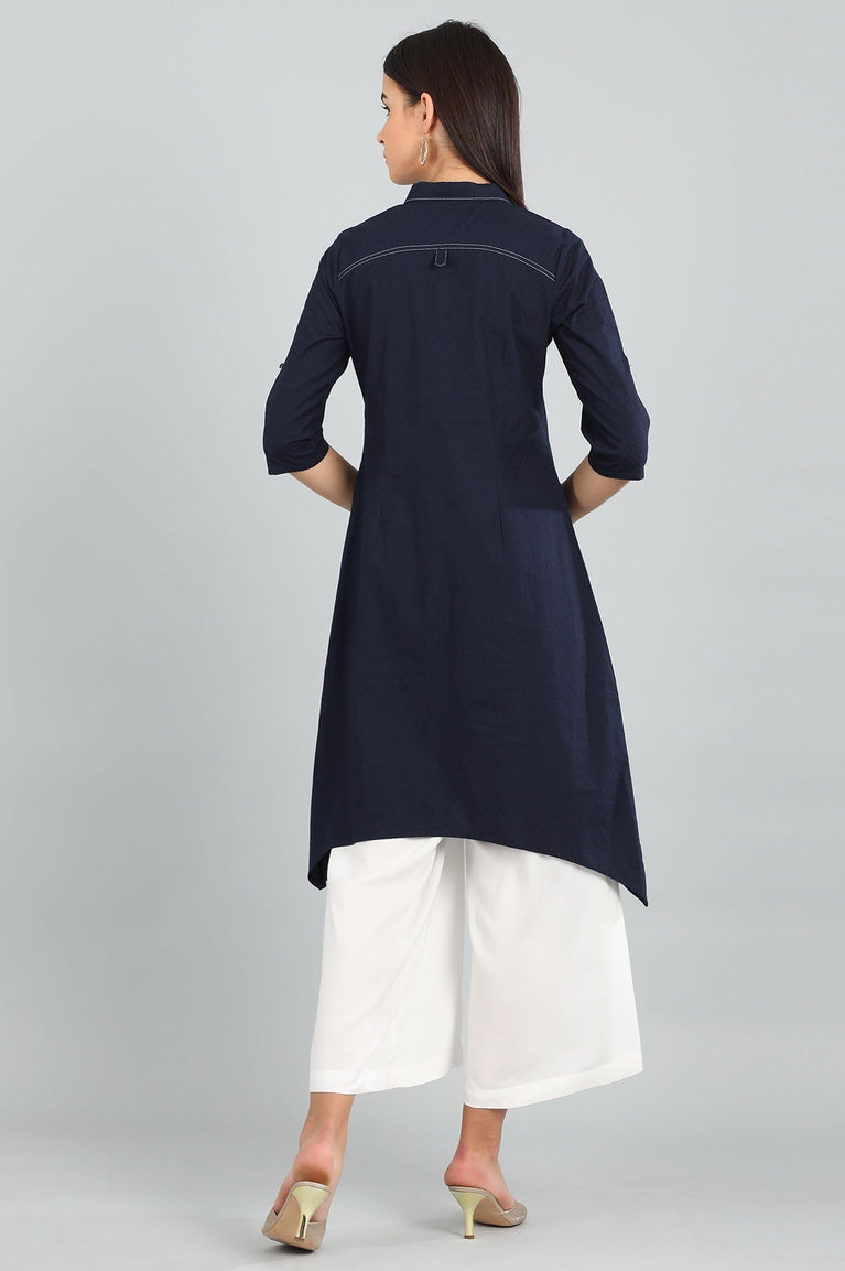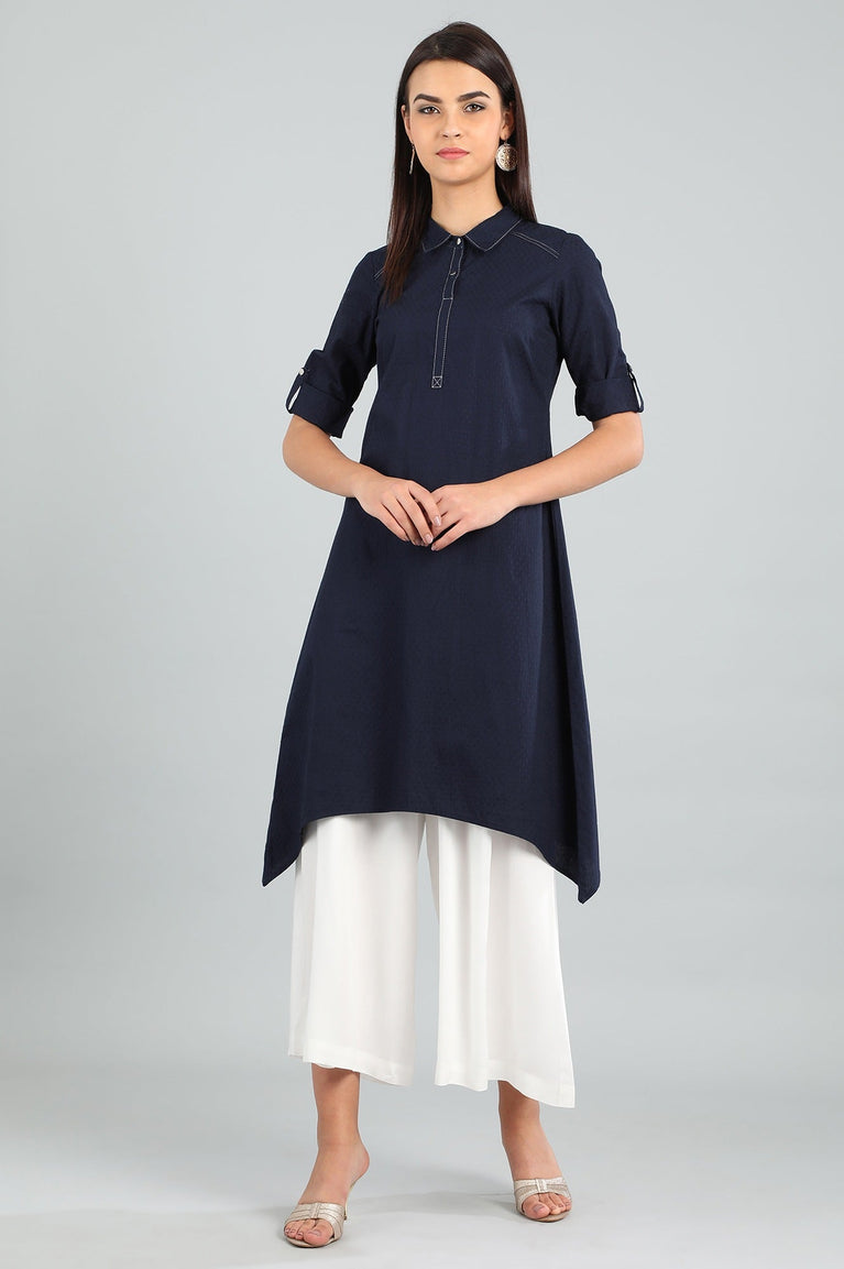 Navy blue Y/D A-line kurta in shirt collar with half placket and buttons. The kurta also features rolled-up sleeves.