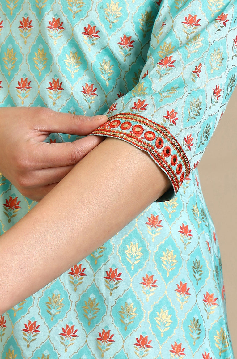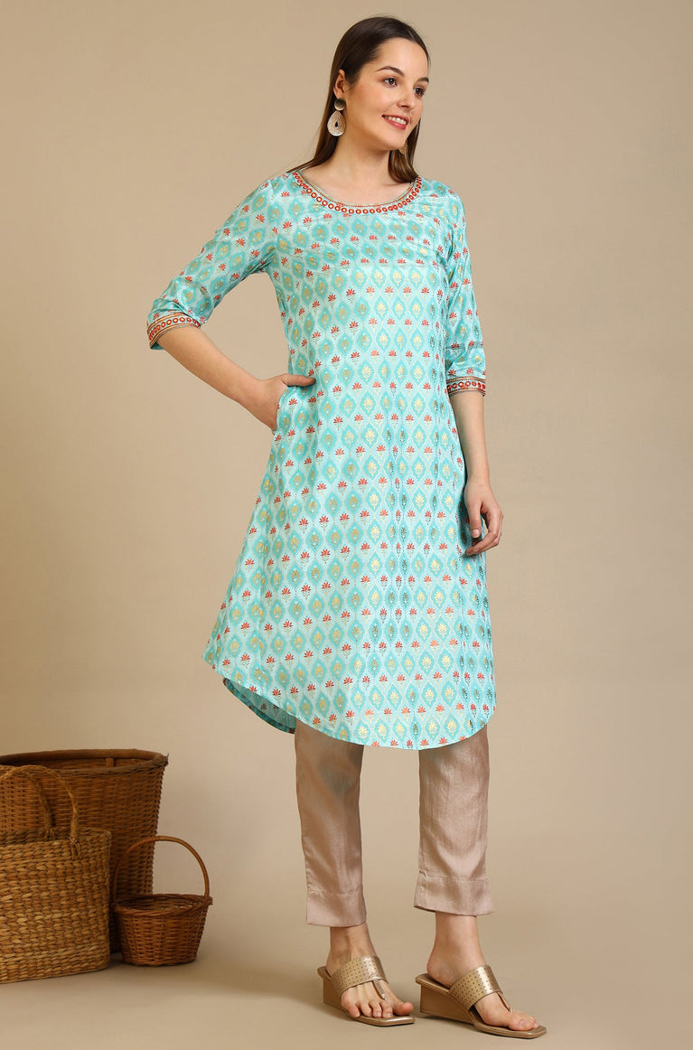 This Sky Blue Mandarin Neck 3/4 Sleeve kurta Has Button Placket With High-Low Hem And Side Slits.