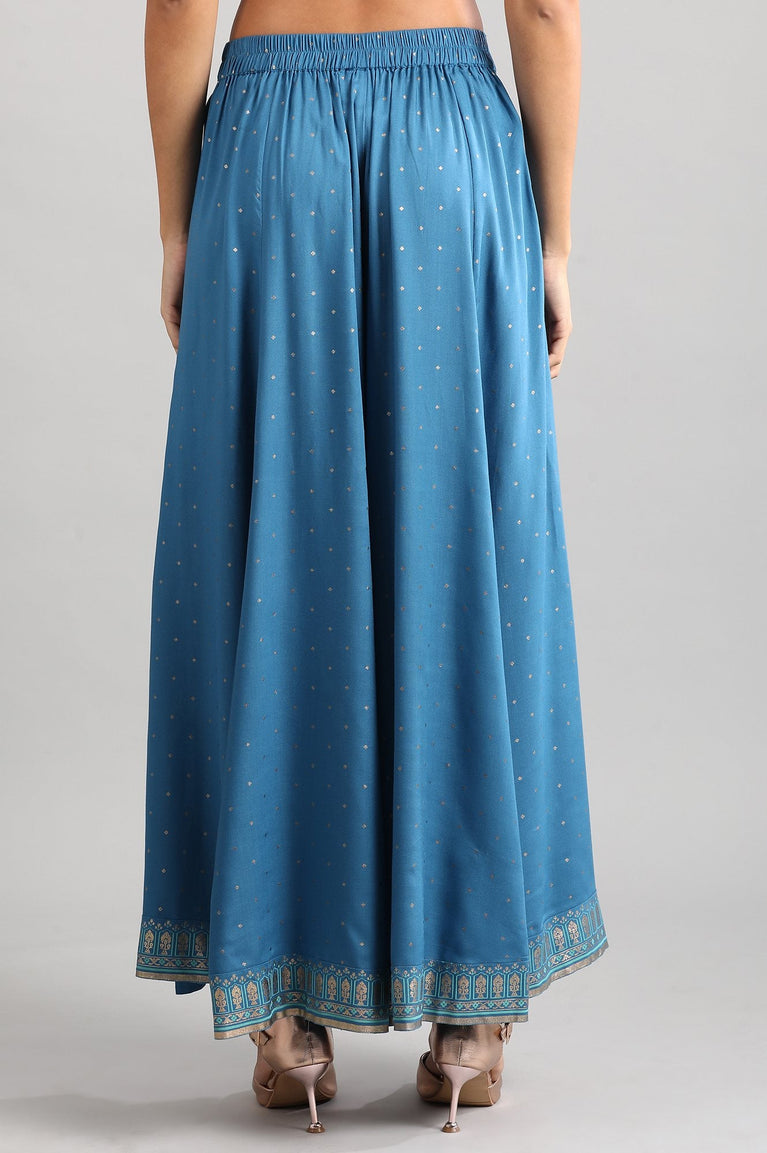 Blue coloured straight fit cotton palazzos with floral foil print detail and an elasticated waistband.