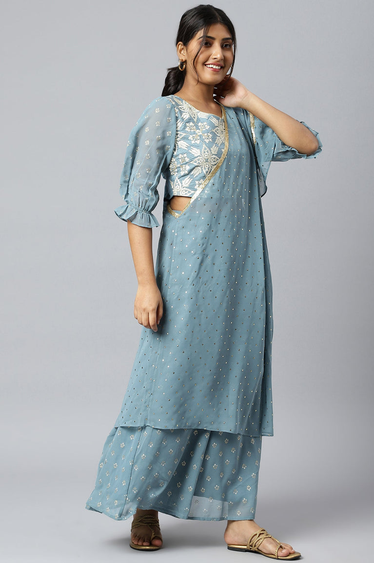 Blue Mist Embroidered Crop Top with Palazzo and Drape