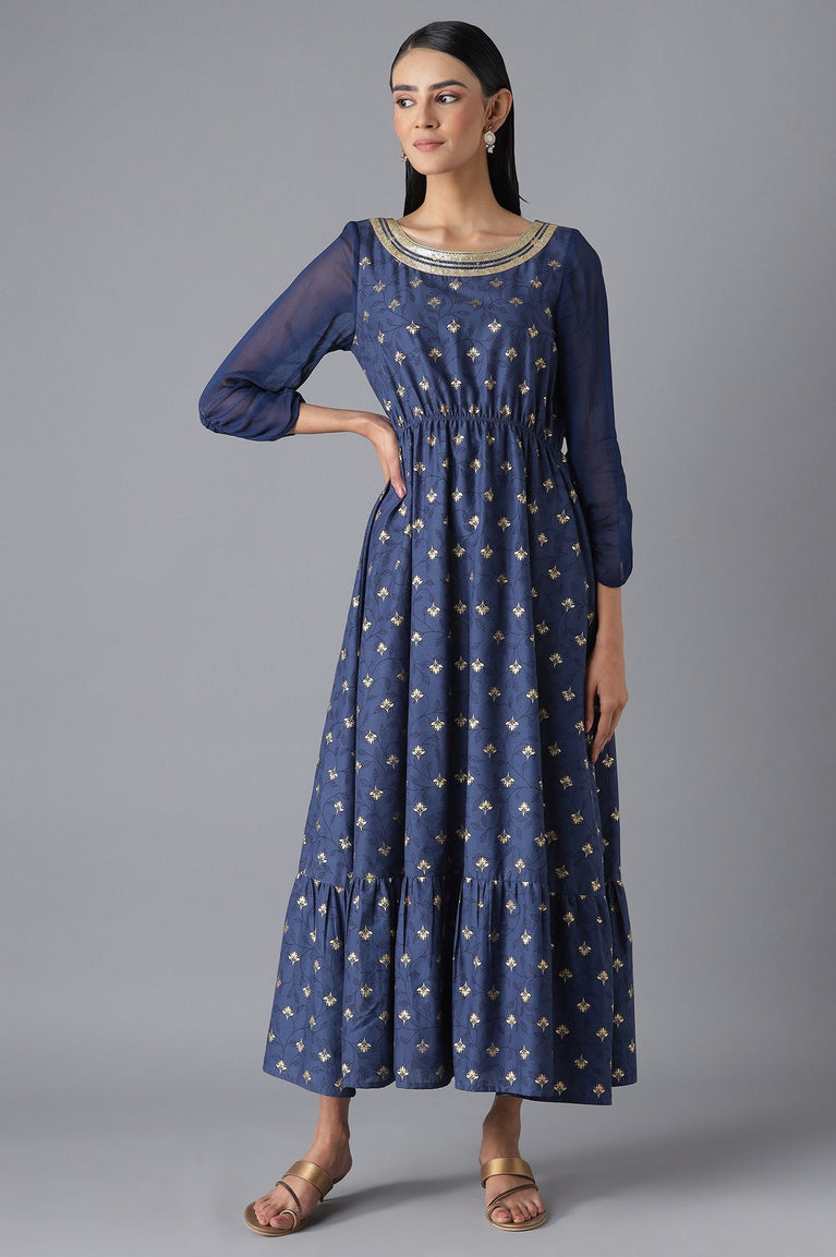 Our printed anarkali kurta is a statement piece. It features a round neck adorned with piping and contrasting buttons on the front panel, adding a trendy twist to the design. Additionally, a dori tie is provided for easy adjustment, ensuring a comfortable and flattering fit. This kurta is perfect for elevating your style with its combination of traditional and modern elements.