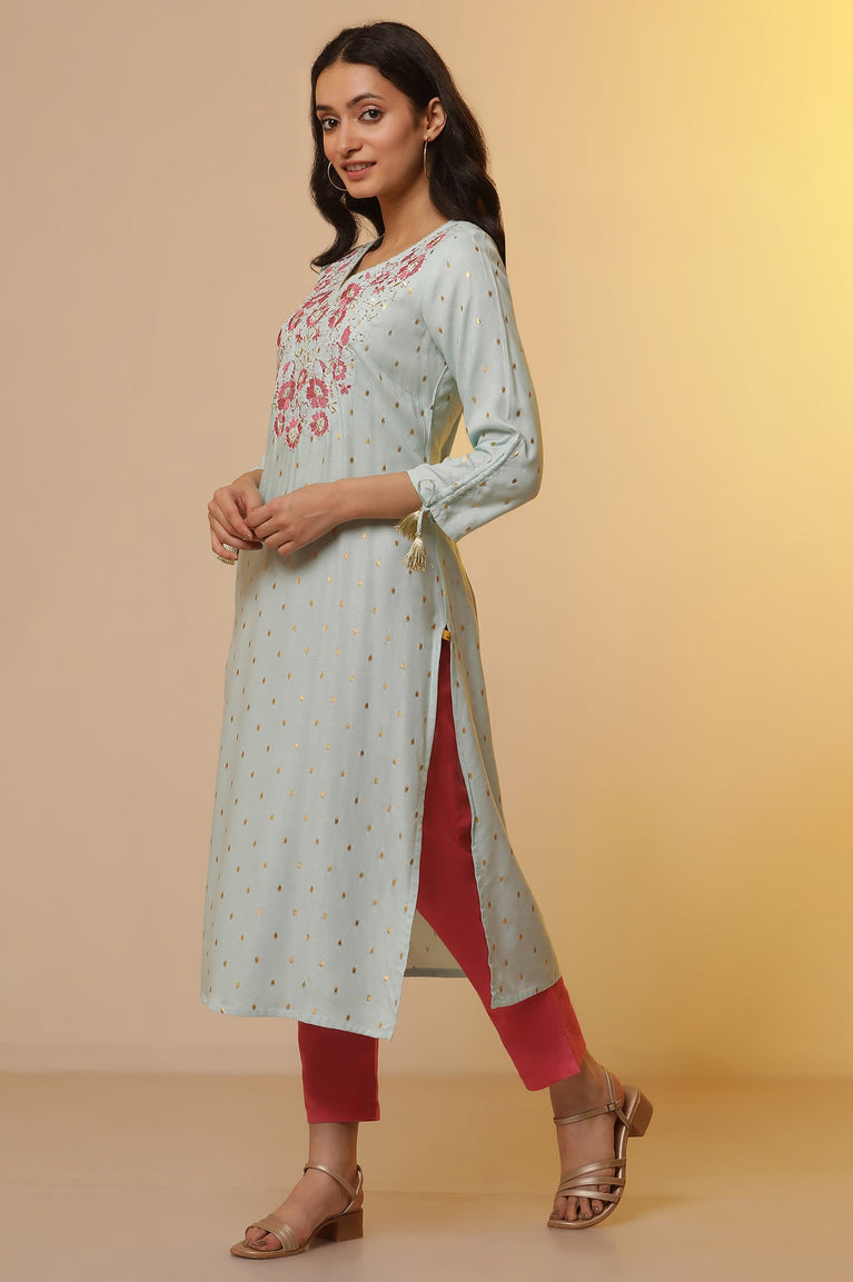 Be it family get together or a light festivity, this ethnic kurta and palazzo set is a must-have. Style yourself in this pretty feminine set, which includes a straight fit kurta and paired with printed straight palazzo.
