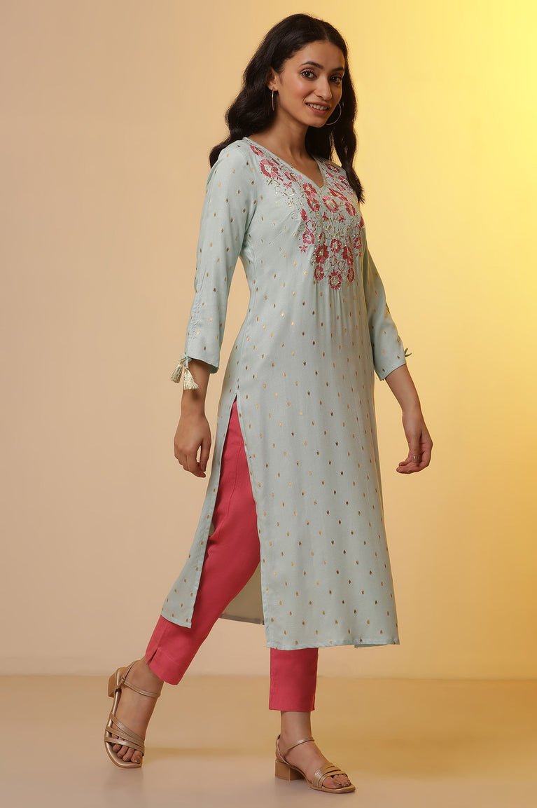 Elevate your casual day or office look by wearing this blue floral print kurta in straight silhouette. It is paired with pink tousers that add a class in your look.