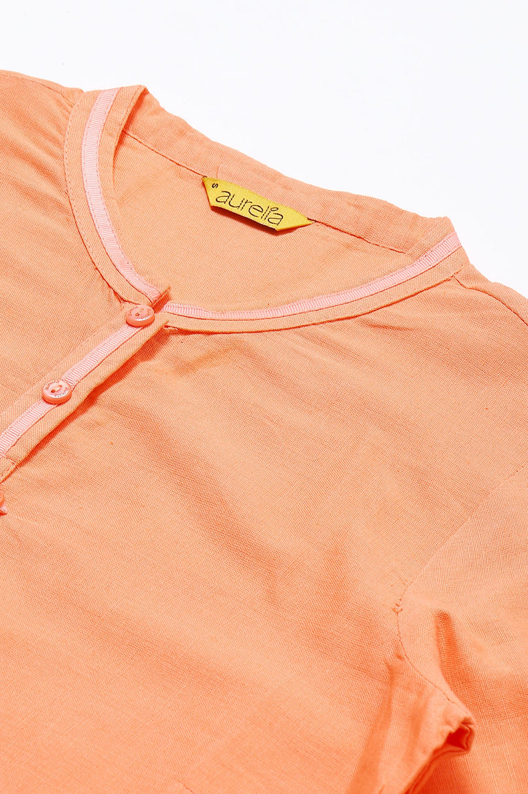 This playful co-ordset in colourful print is an effortless go to, for everyday outing. It's comfortable cut and added pockets makes it an absolute choice. V-neckline and v cut on sleeve's hemline make the piece stylish and classy. The kurta comes with matching pants having elasticated waistband.