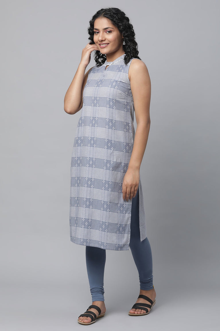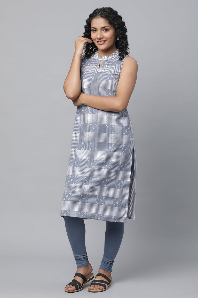 Get The Stylish Airport Look With This Cotton Checker kurta Set. The Set Has Sleeveless Straight kurta In Round Neck And V Cut. It Is Paired With Solid Tights.