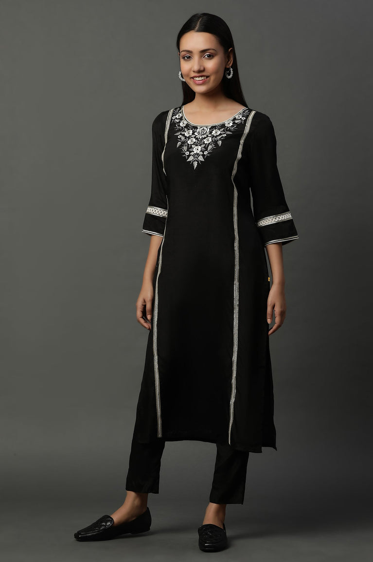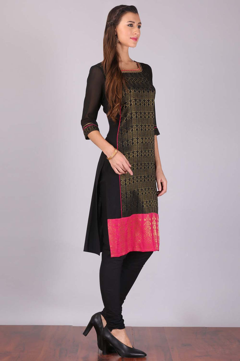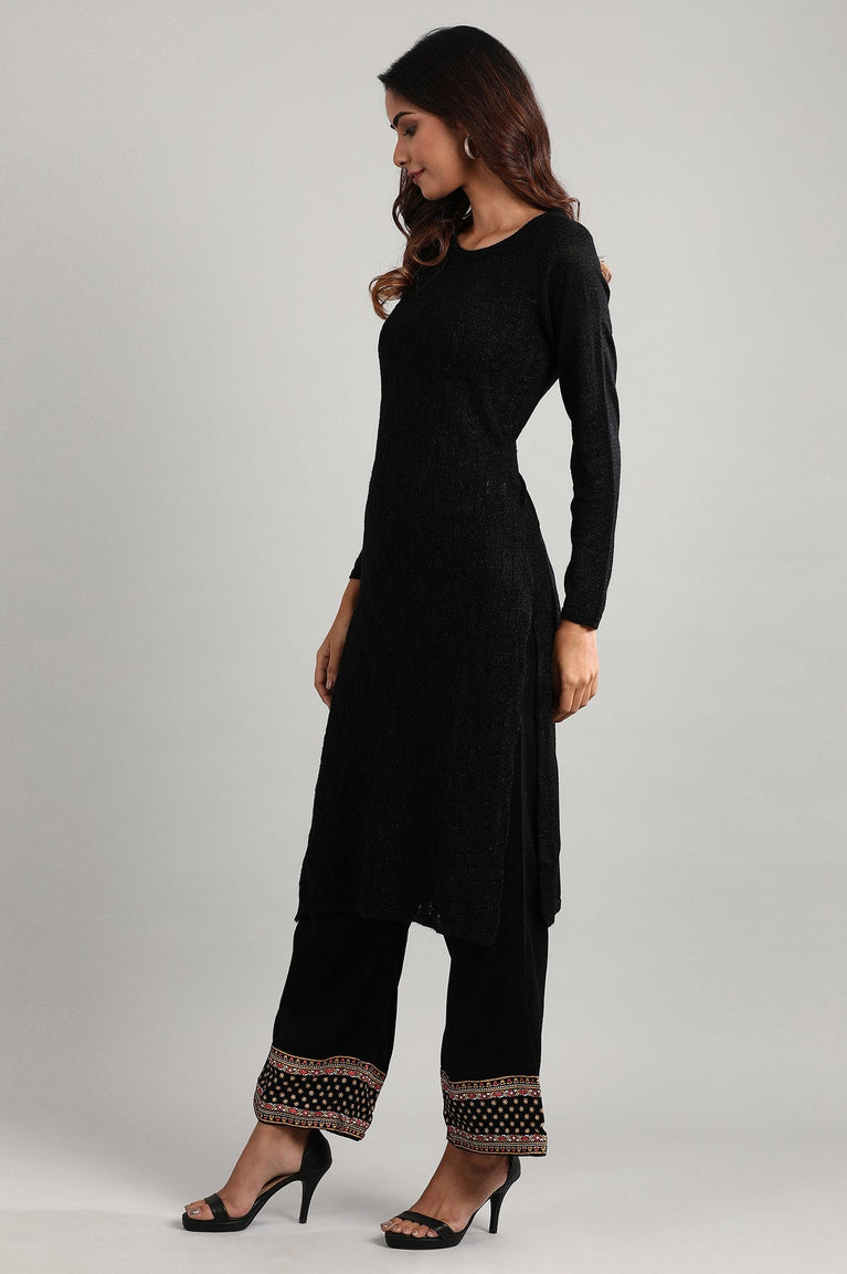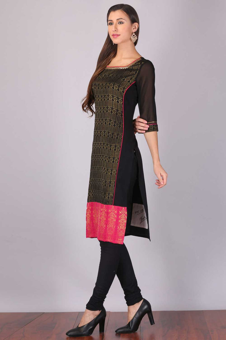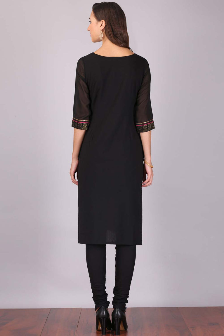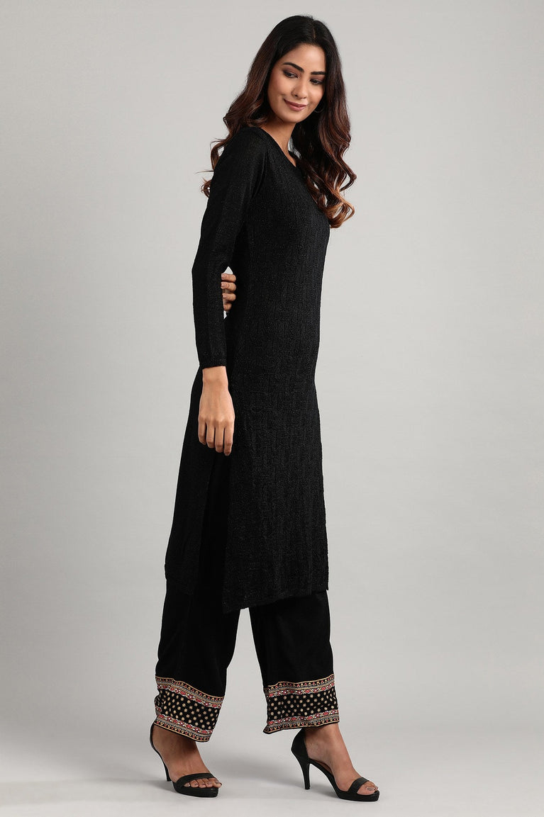 Black coloured straight kurta having ornamenral glitter print, round neck type, three-quarter sleeves and side slits.