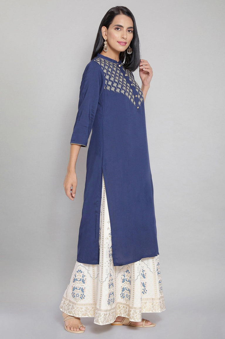 Get the chic and charming look by wearing this dark blue kurta. Crafted in premium fabric, the kurta flatters zari embroidery on yoke and comes in mandarin collar with button closure.