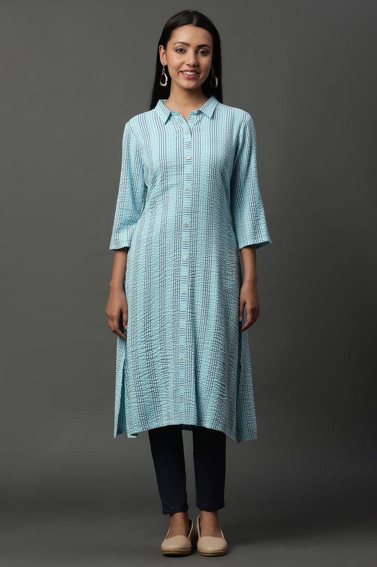Blue and White Seer Sucker Lurex Stripes Flared Kurta
