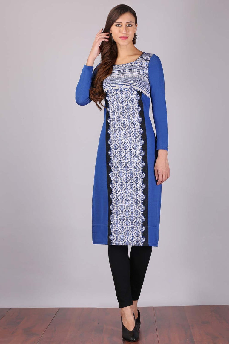 Blue Printed Round Neck Winter kurta