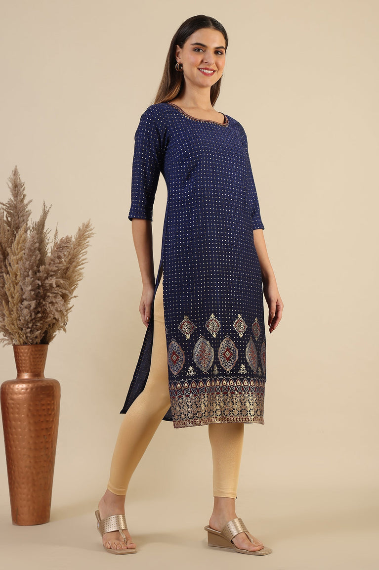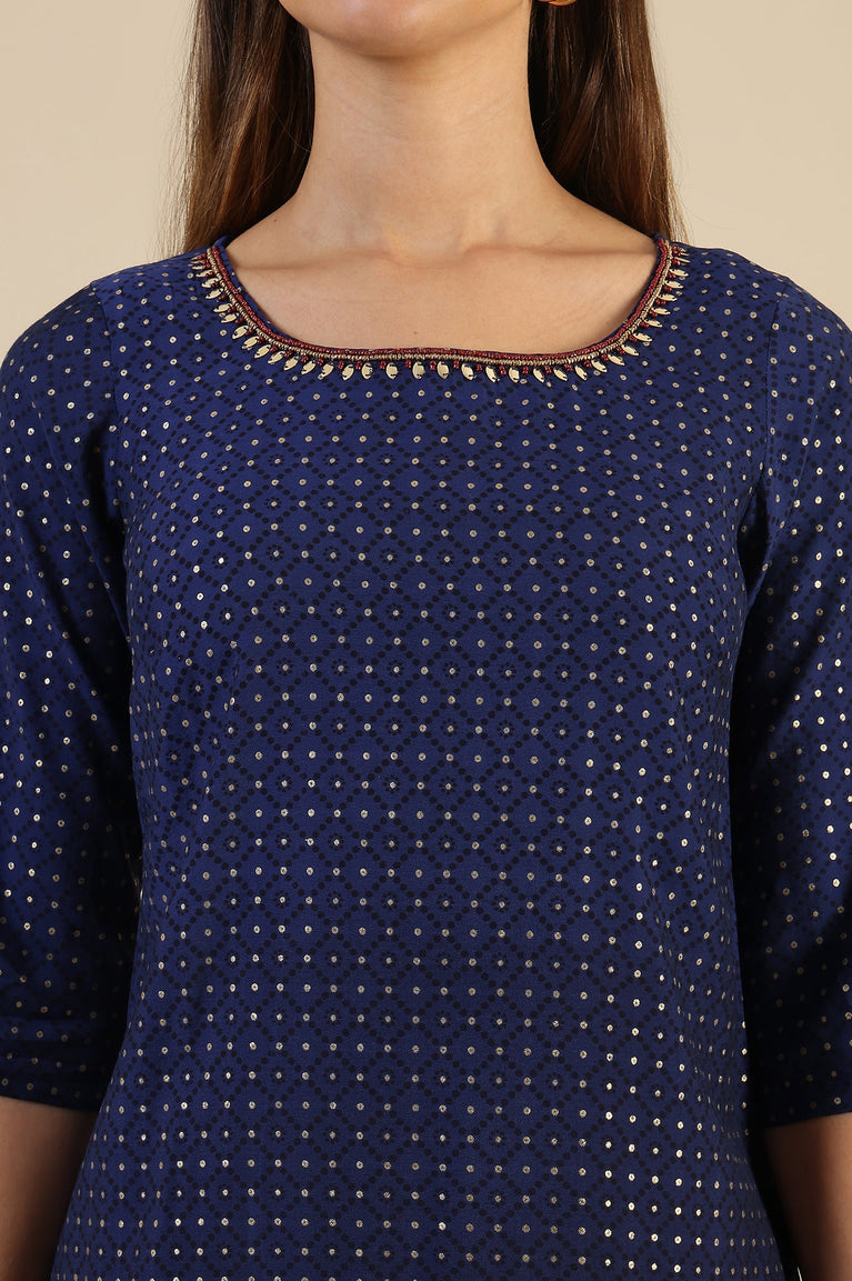 Sailor blue coloured straight kurta having ornamental foil print, sequin embellishment, mandrin collar with buttoned placket and three-quarter sleeves.