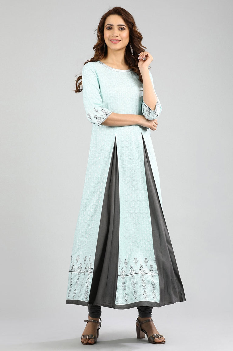 Pagoda blue printed kurta in round neck and three-quarter sleeves.