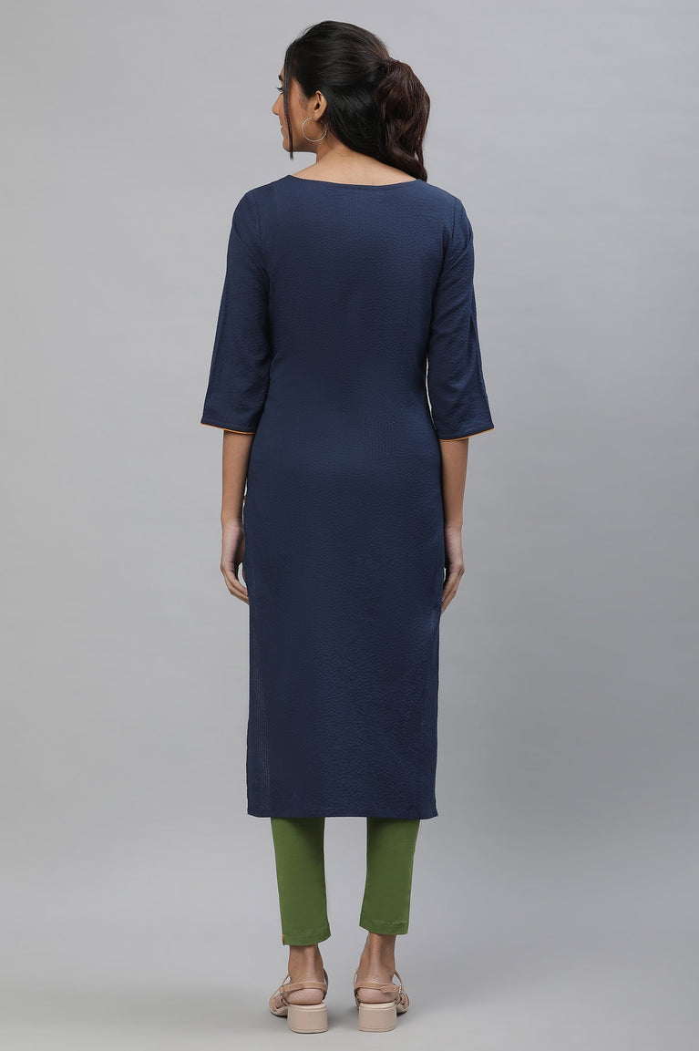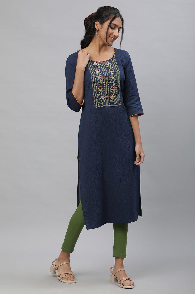 This blue round neck 3/4 sleeve kurta has printed detail and side slits.