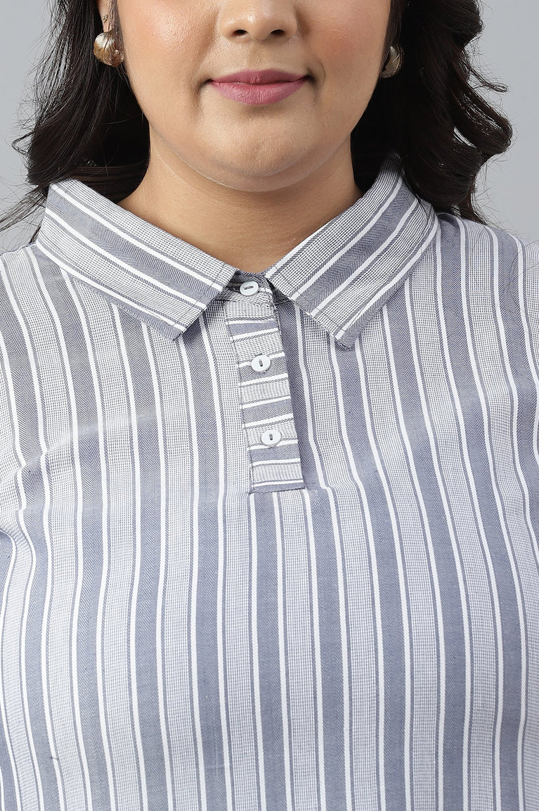 Blue Stripe Print Shirt Collar Plus Size kurta