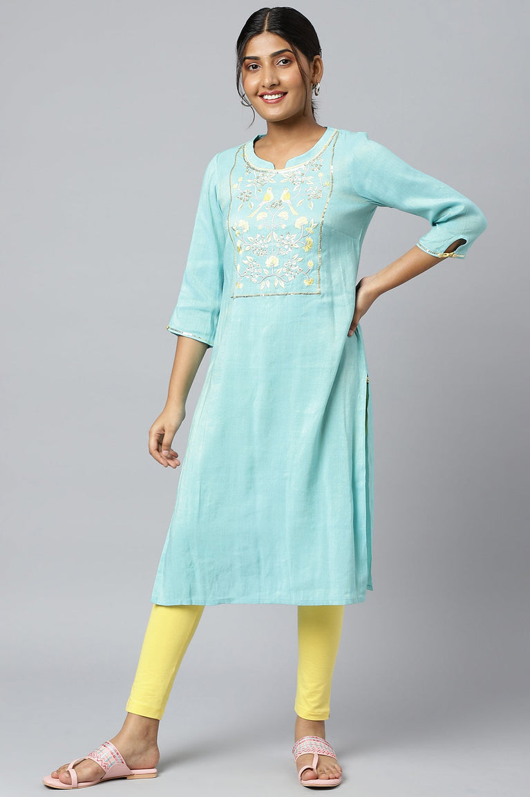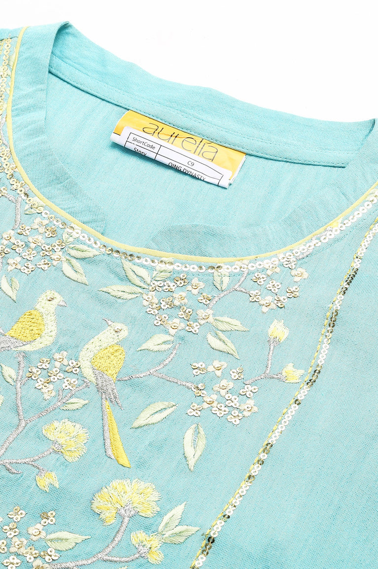 This festive season revamp your wardrobe with this Aurelia's must-have kurta. Blue foil printed kurta having sequin work on neck. It features round neck and three-qaurter sleeves.