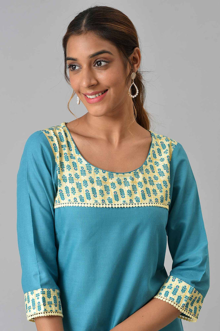 Feel Astounding In This Airy Blue Yarn Dyed kurta Accentuated With A Contast Lace Running All Around The Collar, Yoke And Sleeve Cuffs. This Is Sure To Make You Feel Top Notch.